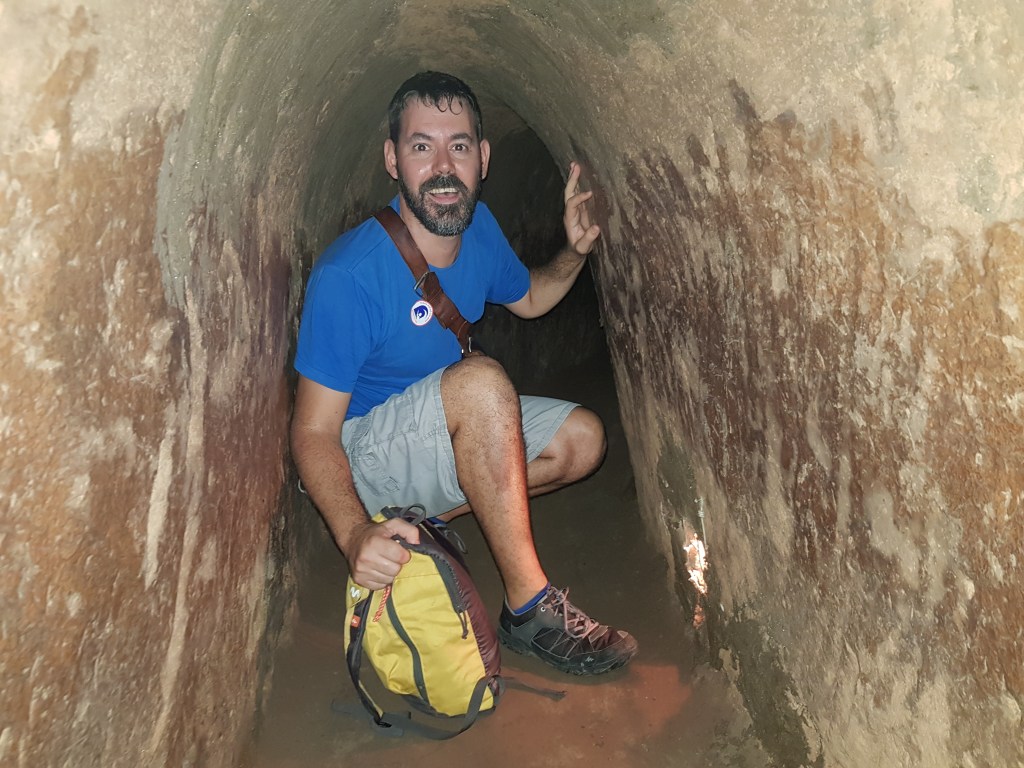 Els túnels Cu Chi mostren com l’estratègia i l’enginy dels soldats del Vietnam van convertir en un infern la campanya americana al país asiàtic. Mitjançant túnels minúsculs van poder aparèixer i desaparèixer a la vegada que feien caure els enemics en sofisticades trampes que t’ensenyen amb tot luxe de detalls. Una de les atraccions de l’excursió és poder fer un tros de túnel per viure l’experiència. Són uns 100 metres i pots sortir cada 20 metres aproximadament, però si tens un senyor davant que s’atura cada metre i mig, entre la claustrofòbia i la calor ho fan una experiència realment dura. Vaig haver de tancar els ulls per oblidar que estava 4 metres sota terra i posar-hi molta paciència. Evidentment no hi havia perill real, però els que teniu claustrofòbia m’entendreu. O us preguntareu perquè m’hi vaig ficar i té lògica, però ho havia de fer, no puc anar als túnels i quedar-me fora.