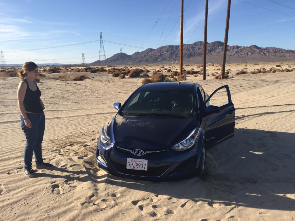 Entre Los Ángeles i el Grand Canyon vam anar seguint el desert de Mojave, tot parant a llocs emblemàtics de la ruta 66 i fent fotografies. En un moment determinat li vaig demanar a la Mar que, aprofitant que no havíem vist pràcticament cap cotxe en quilòmetres, si podia aturar-se a un cantó de la carretera per poder fer fotografies del desert, el paisatge… PERÒ SENSE ENDINSAR-SE AL DESERT, ja que era sorra i ens podiem quedar atrapats. El problema va ser que quan jo vaig dir si podia aturar-se a un cantó la Mar ja es va ficar directa al desert i el cotxe es va quedar aturat i s’anava enfonsant a la sorra una mica més cada cop que intentavem sortir. El problema principal és que eestavem a carreteres antigues poc transitades i, com us deia, no havíem vist un cotxe en la darrera mitja hora o més. Vam intentar trucar i no teníem senyal, vam intentar trucs per sortir però res funcionava i ens vam ficar força/molt nerviosos imaginant-nos dormint dins el cotxe en una zona tan remota. Per sort passada una hora aproximadament va passar una senyora en una Pickup que ens va dir que ella vivia prop d’alla i que anava a avisar al seu marit que ens ajudaria. Ens va costar de creure que prop d’allà hi visqués algú però en efecte als pocs minuts apareixia el marit en un monstre de rodes gegants, enganxava el cotxe amb uns ganxos mentre uns amics que havíen vingut en un altre cotxe monstruós feien bromes, ens va donar dues ampolletes d’aigua i ens va remolcar fora de la sorra. Quina gent més encantadora…