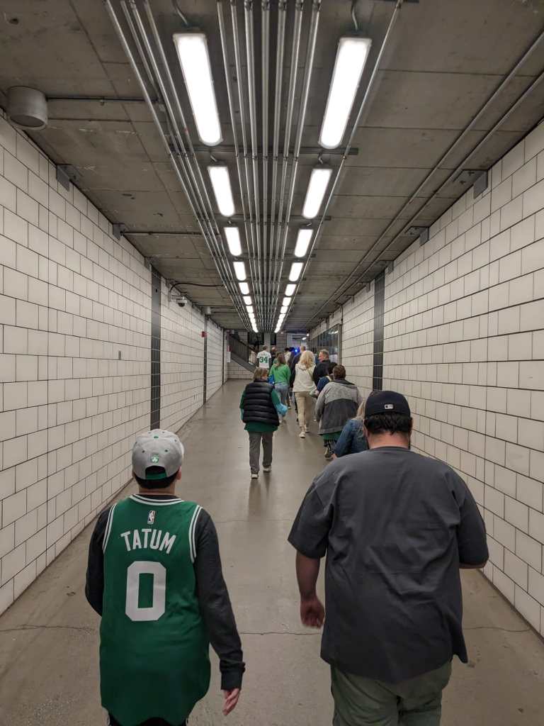 Duia l’entrada en un codi QR així que després d’una lleu revisió (anava només amb una ronyonera on hi duia la bateria externa, el cable, el moneder, el mòbil i la meva ploma d’adrenalina per les alèrgies) vaig enseyar el codi al senyor de la maquinota i ja era dins. He de dir que l’accés a l’estadi és facilíssim: baixes a l’estació de North Station i des del propi metro pots accedir a l’estadi; només has d’anar seguint les samarretes dels Tatum, Horford, Brown i companyia.