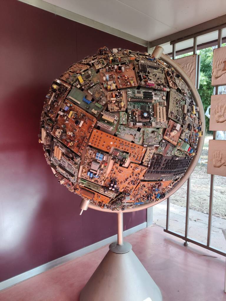 Sense fer un trajecte massa llarg ens vam acostar al Parc Art de Cassà on en Jaume Roser i la seva família han creat un entorn idíl·lic amb més de 300 obres que van des de globus terraquis creats amb trossos de màquines i xips a uns laberints super especials passant per obres interactives amb les que la Greta s’ho va passar la mar de bé. El nom no podria ser més adequat ja que es tracta d’un parc amb els seus llacs i els laberints que us mencionada i està farcit d’obres d’art super originals.