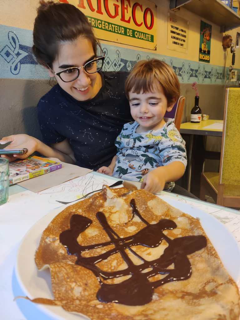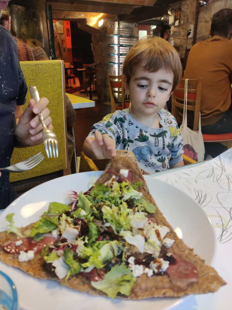 Vam arribar a Girona passades les 2 amb la Greta cridant “creeeeps, creeeeps” pel casc antic així que l’elecció estava clara: dinaríem a la Creperie Bretone. Vam tastar un parell de galettes que no havíem tastat mai (delicioses!!), una amanida i ens en vam partir una de xocolata mentre quadràvem horaris perquè els museus tancaven tots a les 6! Havíem quedat amb els amics de entre7maletas per fer les visites de la tarda junts així que un cop dinats i amb la Greta neta de xocolata (i el que va costar) ens vam dirigir als Banys Àrabs.