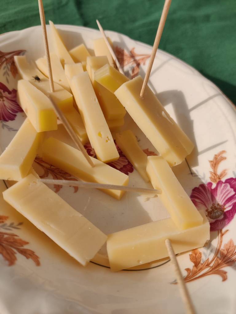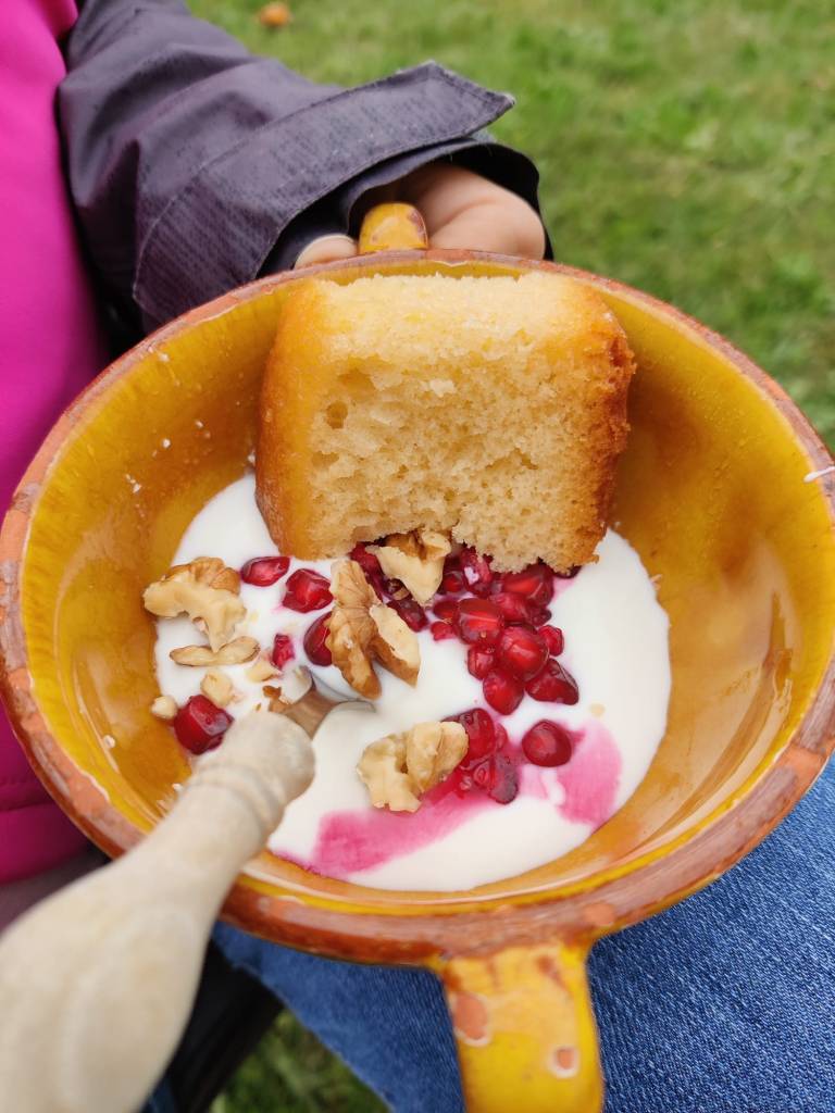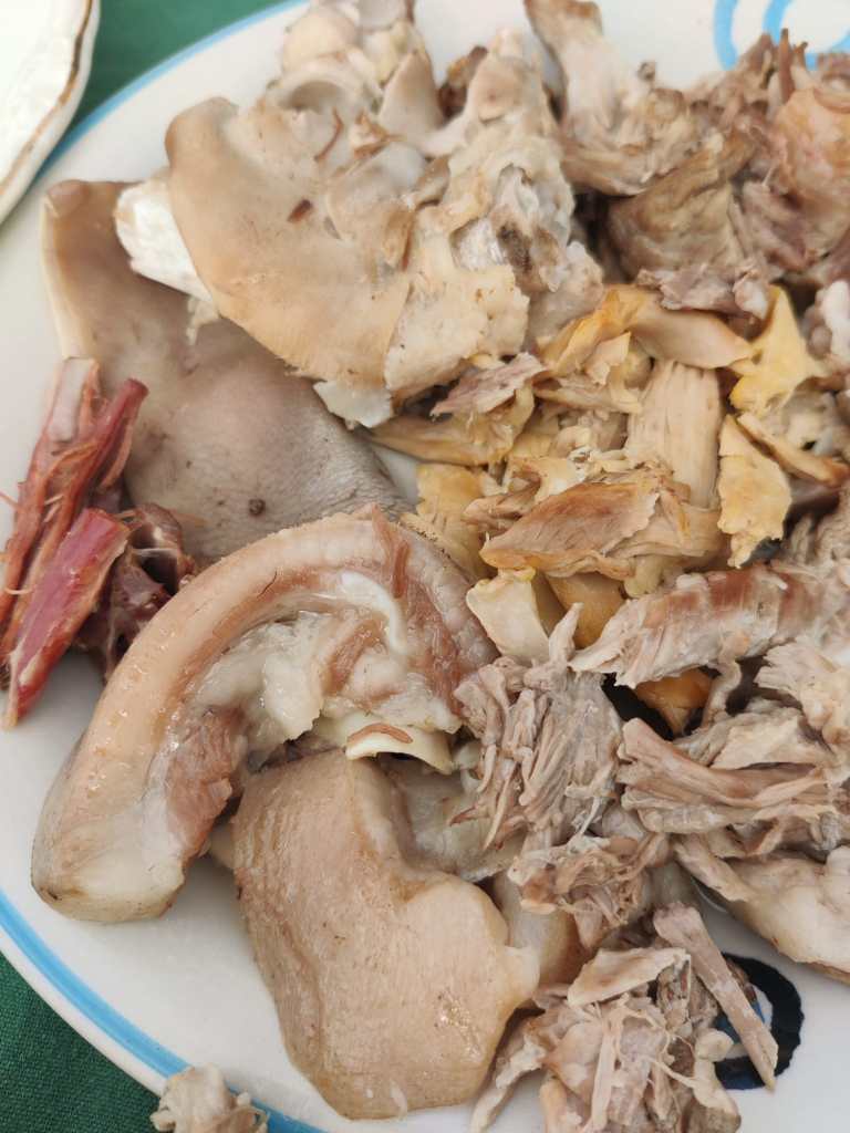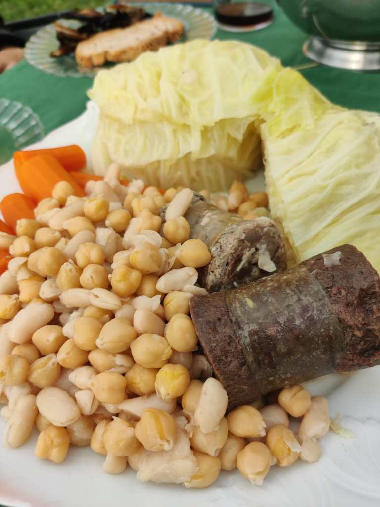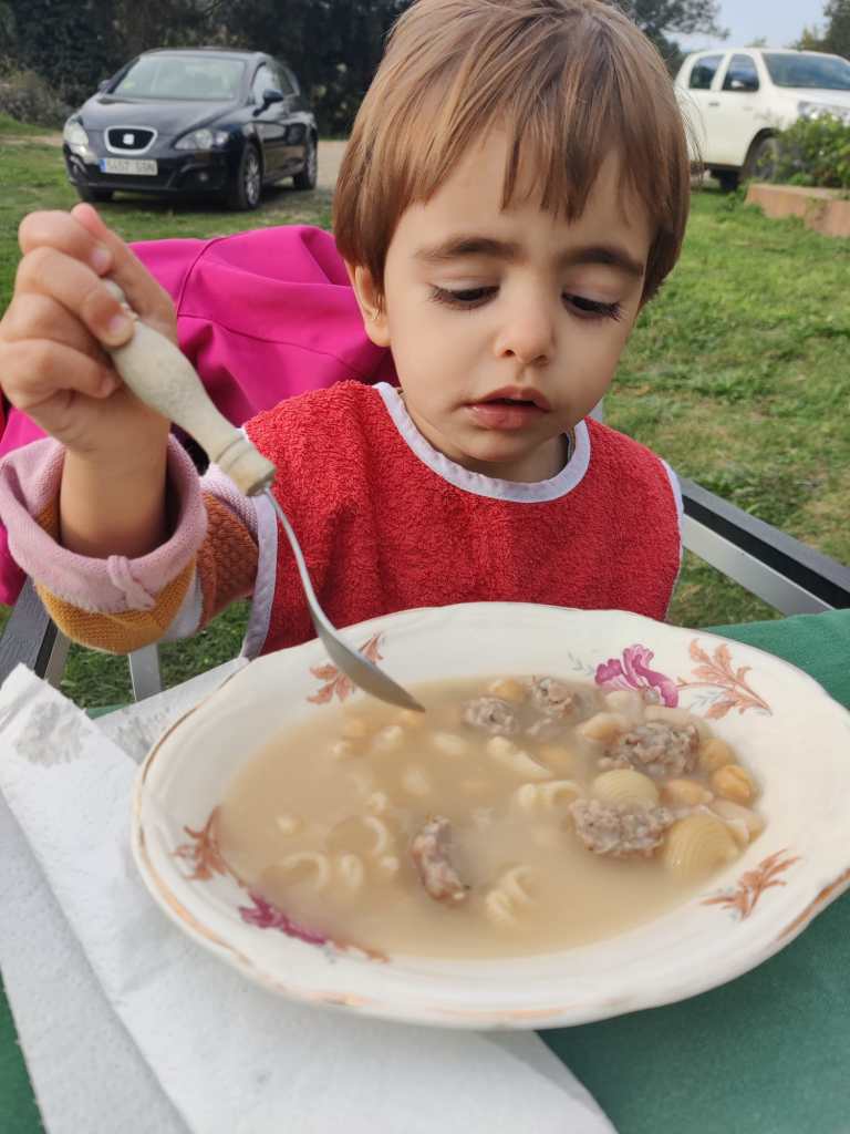 Al nostre planning hi posava que ens donarien productes de km 0 per dinar però la realitat va ser molt diferent i anys llum millor: l’Anna ens va convidar a la seva masia a dinar. Vam començar per picotejar embotits, carxofes i truita de patates (feta amb ous de les seves gallines, què grocs eren!) i una escudella amb carn d’olla deliciosa.