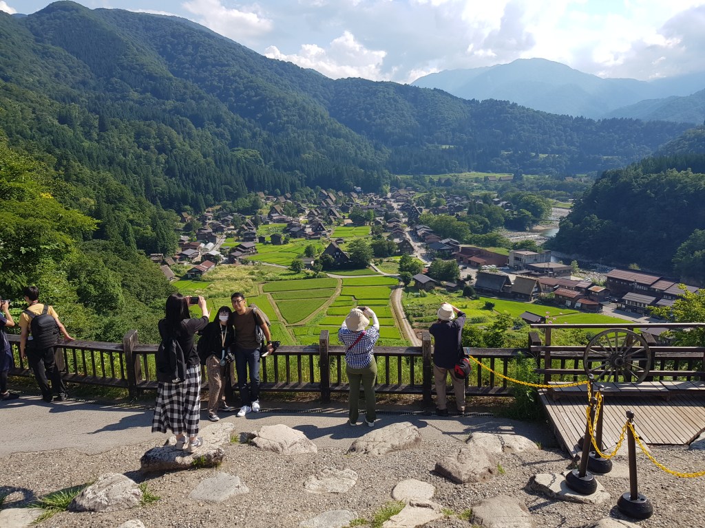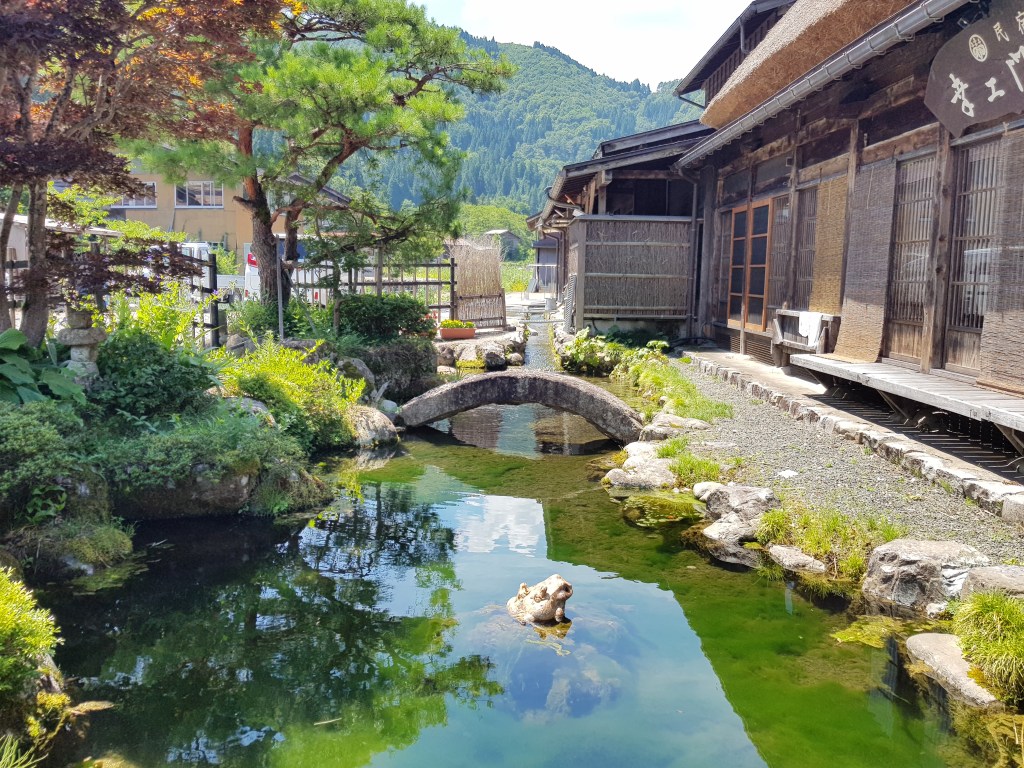 En bus des de Kanazawa és una hora aproximadament que nosaltres vam fer amb els Highway Express Bus (i molt contents, fins i tot vam dormir una mica). La calor tornava a estar molt present però, per sort, durant el trajecte vam anar trobant fonts i una espècie de carxofes de dutxa on, literalment, ens hi ficavem sota per sufocar els efectes de la calor i la humitat.