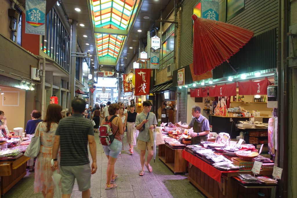 L’hora de dinar s’acostava, així que vam fer cap al Mercat Nishiki, el més important de la ciutat (i el més turístic) amb la idea de seguir explorant a peu la ciutat i gaudir d’una pluja fina que ens estava salvant de la calor.