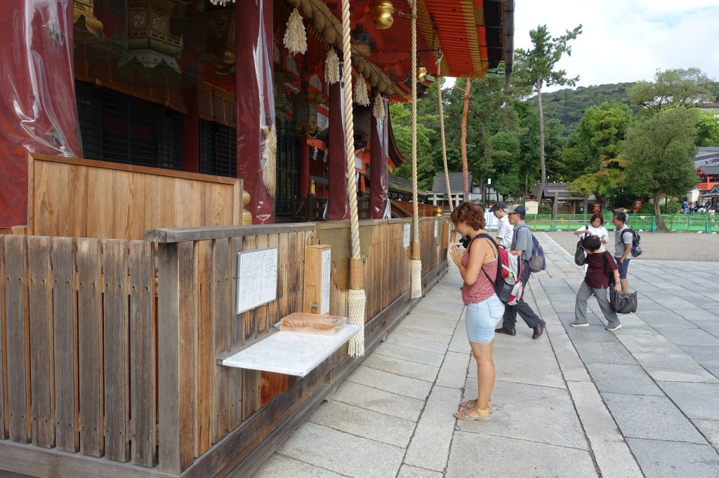 Per seguir coneixent la ciutat a peu (la millor manwera d’ubicar-te a posteriori quan hi portis uns dies) ens vam dirigir cap a la zona del Gion, el famós districte de les geishes i de l’oci nocturn de Kyoto (i on, en conseqüència, tot és caríssim). Des d’allà volíem començar la ruta pels temples d’Higashiyama així que vam entrar al Temple Yasaka, el temple de les geishes. Ens va sorprendre per la seva bellesa arquitectònica, així com pels múltiples rituals que es poden efectuar un cop dins, com el de demanar un desig i tocar una campana fent una sèrie de reverències abans, durant i després de la petició. Vam haver d’esperar a que ho fessin uns quants locals per fer bé (suposadament) la combinació.
