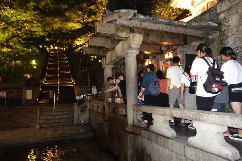 Vam aprofitar per anar a l’hotel a fer rentadores i a preparar-nos per anar a veure el Kyomizudera, el temple de l’aigua pura, aprofitant el Sennichi Mairi. Durant l’Obon, en concret els dies 14, 15 i 16 d’agost, es pot visitar un dels temples més emblemàtics de la ciutat durant la nit i si ho fas en aquelles dates, és com si l’haguessis visitat 1.000 cops. Així que molta gent aprofita per fer-hi ofrenes i pregàries perquè aquestes valguin també per 1.000. Per altra banda, és també un dels 3 únics moments en que obren les dependències privades del temple, així que és una ocasió doblement especial que no volíem desaprofitar. El temple és espectacular, un dels imprescindibles de Kyoto sense cap mena de dubte, tant pels edificis, com per la seva ubicació amb unes vistes de la ciutat o per la cascada Otowa-no-taki, on la gent beu aigua per, diuen, aconseguir salut i longevitat. Directe al nostre Top 10 de Kyoto.