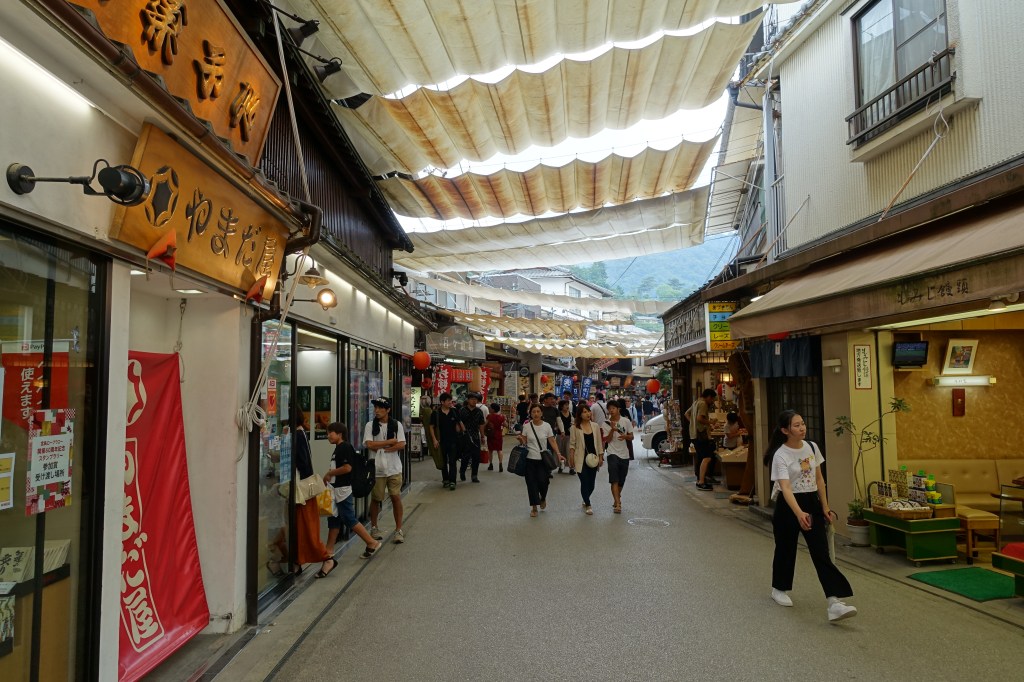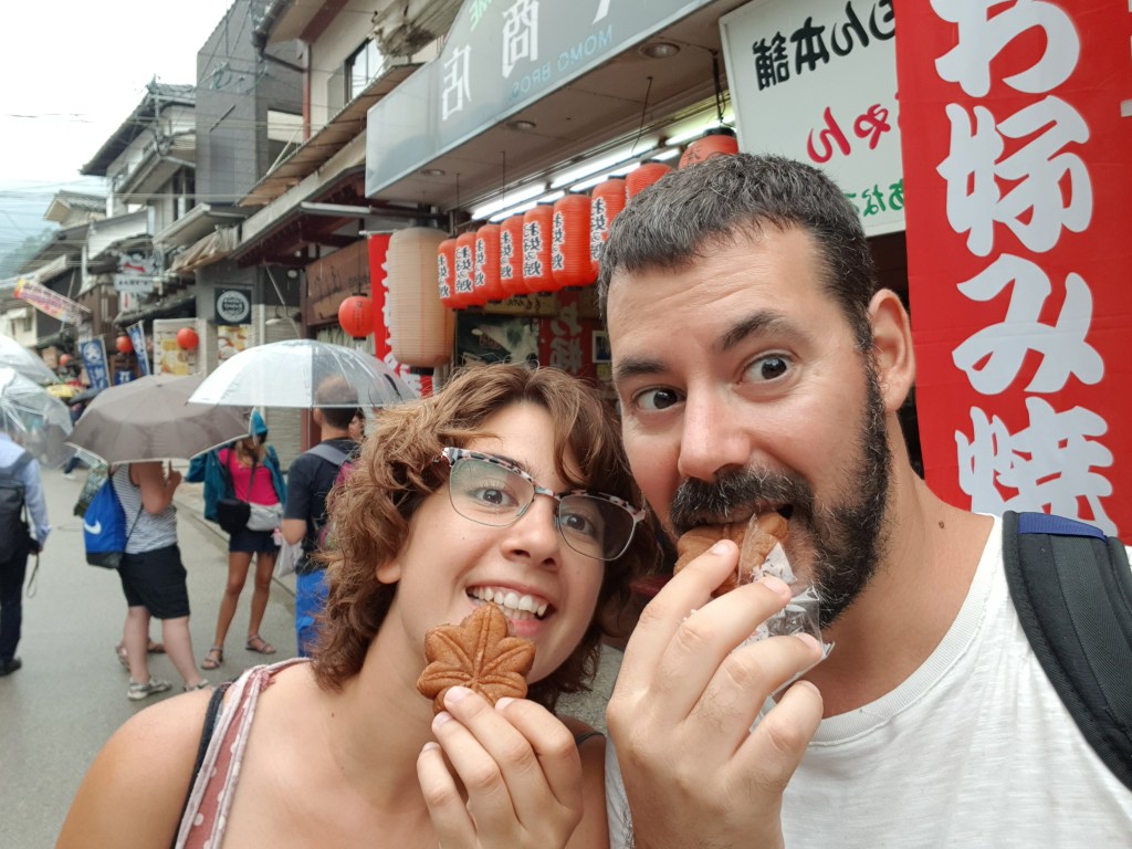 Mentre refèiem el nostre planning intentant no desistir del bany (tot i que pintava difícil), vam comprar uns souvenirs a l’Omotesando, el carrer comercial de Miyajima on es poden trobar paradetes de menjar, botiguetes de souvenirs i un munt de petites joies com la botiga de salses de soja, on vam estar ben bé 20 minuts tastant-ne de diferents fins a quedar-nos amb una de bàsica i una d’ànguila que era deliciosa. Vam decidir donar una segona oportunitata l’okonomiyaki “Hiroshima style” en un lloc molt ben puntuat i era més bo que el de la senyora del Okonomimura, però seguíem considerant-nos fans de la versió d’Osaka.