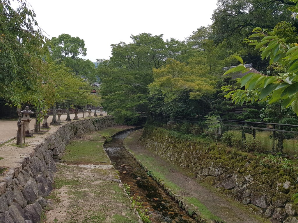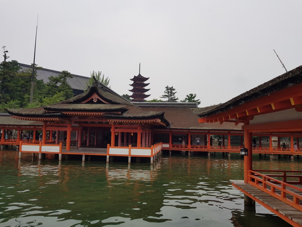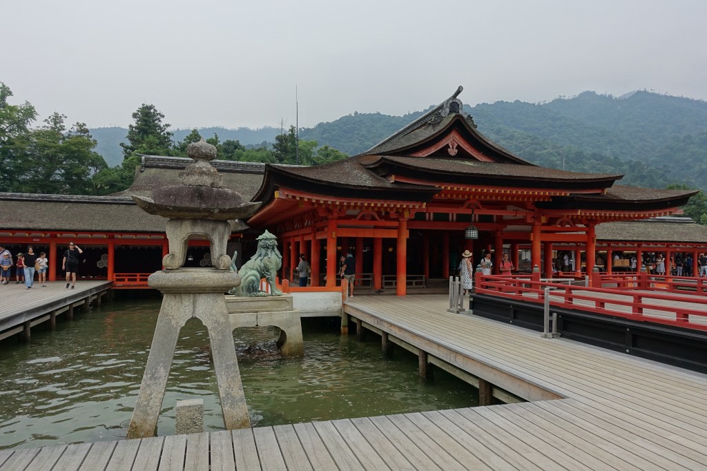 Vam esmorzar i ens vam proposar que aquell dia, si o si, ens banyaríem. Durant tot el viatge havíem patit una calor insoportable i mai hi havia on sucar-se però aquell cop era diferent. Havíem identificat una platja a l’altra banda de la illa on s’hi arribava en bus i la idea era anar-hi després de la visita a l’Itsukushima jinja, aprofitant que les marees així ho aconsellaven. Amb l’aigua gairebé al seu punt més alt, vam gaudir com vedells de la visita a un dels santuaris més especials del món. La seva estructura en forma de de port (feta expressament perquè s’hi hagués d’arribar en vaixell, ja que els plebeus no podien trepitjar la illa), les vistes del mar amb la torii des del Takabutai (l’escenari on es feien danses) i els lleons i llanternes que l’adornen fan que miris des d’on miriis, tinguis un motiu per quedar-te 5 minuts i simplement contemplar el que tens davant. I només per 300 yens! Es va posar a ploure a mitja visita, però com la majoria de la visita la fas sota els passadissos, no ens va suposar cap problema. Ara, el tema de banyar-nos, de moment, quedava postposat.