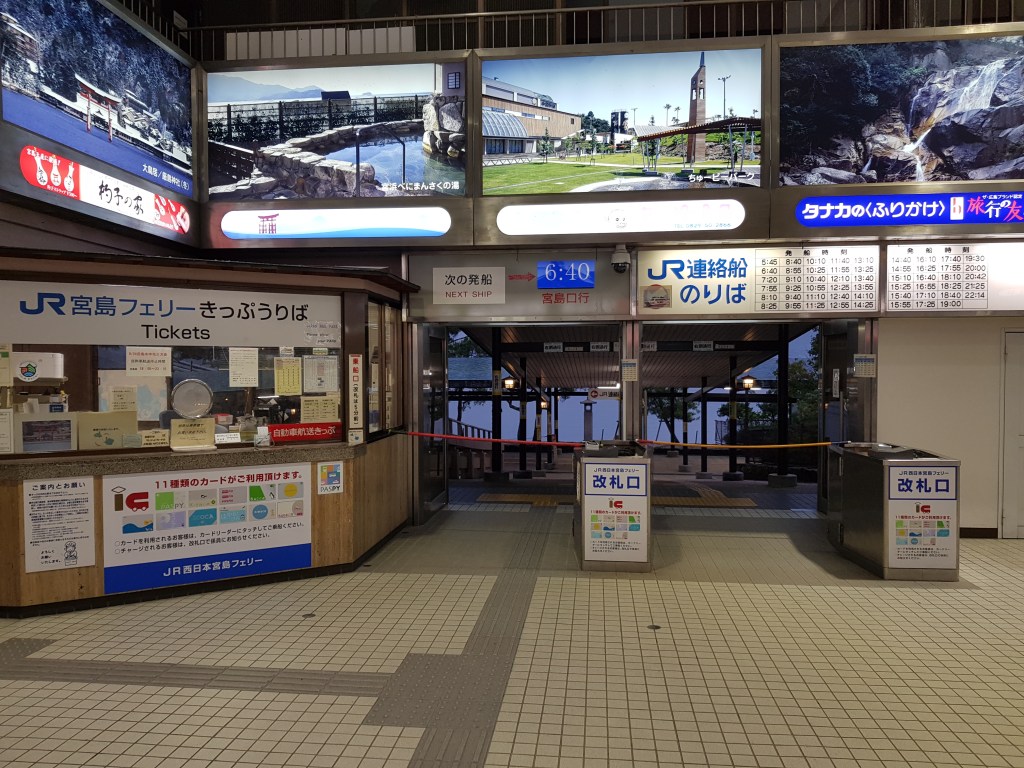 Per començar vam agafar el primer ferry que sortia d’Itsukushima a les 6:40 patint per si, amb aquella boira tan densa, ens apareixeria el Godzilla de dins el mar. Va començar a diluviar així que amb les capelines i corrent com a bojos vam fer el canvi al tren i arribàvem a Hiroshima a les 7:35. Prou bé.