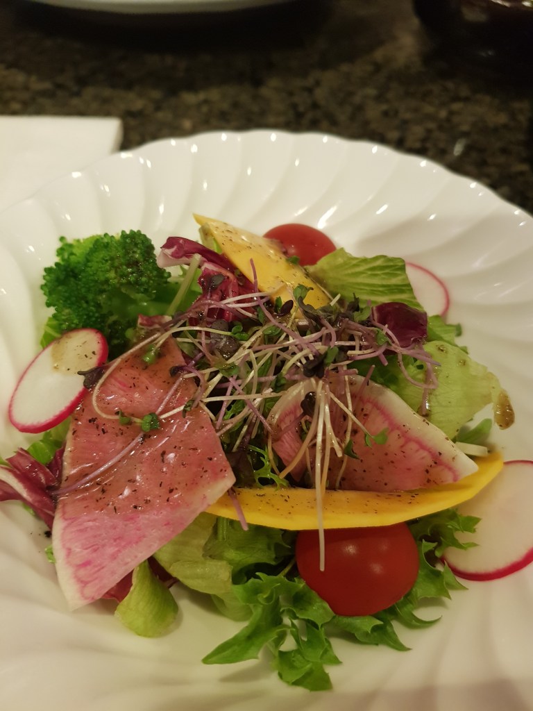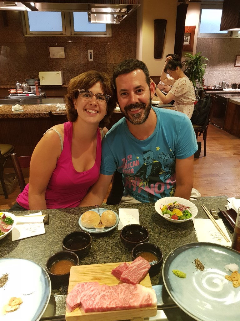 Vam arribar a l’estació de Sannomiya passades les dues del migdia pensant que hauríem d’abortar l’operació però el Mouriya va resultar estar molt més a prop del que pensàvem i vam trobar-lo prou ràpid. Ens van agafar les motxilles amb cara de que amb aquelles pintes no encaixavem massa en un local com aquell i ens van buscar un lloc perquè anéssim mirant la carta. Perquè us feu una idea, hi ha peces de carn des de l’equivalent a uns 40 euros fins a uns 160. Nosaltres vam decidir que, ja que érem allà, tastaríem la més bona i una de senzilla, així també podíem comparar aquests dos trossets i amb la carn de Hida que havíem tastat a Takayama. La part positiva és que a més de la carn, et posen una amanida, un puré de carbassa deliciós, unes verdures saltejades amb el greix de la carn i una selecció de pans, així que no t’has d’alimentar només de la carn. Un cuiner ens va anar cuinant els trossets poc a poc, perquè sempre la mengéssim calenta i la poguéssim condimentar amb una de les 4 opcions o una barreja d’algunes d’elles: all fregit, sal, pebre negre i wasabi.