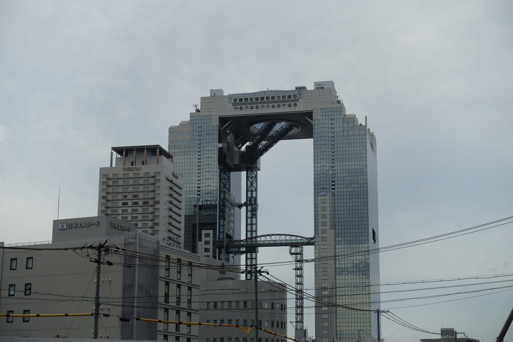 L’edifici consta de dues torres de 40 pisos unides per un jardí-mirador al qual arribes mitjançant unes escales mecàniques espectaculars, ficades en uns tubs transparents des d’on veus la enorme distància que et separa del terra. Les vistes són increïbles miris on miris, ja que la seva ubicació dominant el nord (“kita”) de la ciutat et permeten abarcar tota la ciutat. Encara no ho sabíem mentre ens menjavem un gofre amb la forma de l’edifici, però estavem a punt d’enamorar-nos bastant d’Osaka.