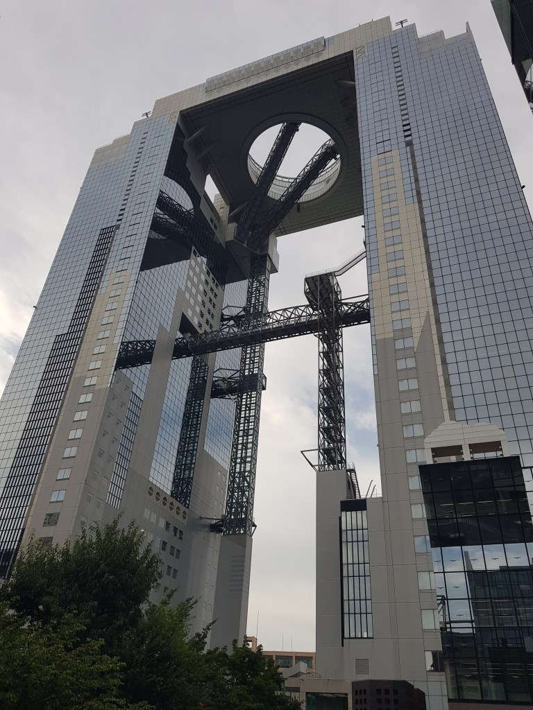 Sabent que no teníem massa dies a Osaka (a la propera visita a Japó ho haurem de compensar), havíem dividit per zones els punts d’interès, així que volíem aprofitar aquella tarda per fer les visites o ens seria molt difícil de quadrar en el planning. Per sort, la visita a l’edifici amb carretera inclosa va ser breu així que ens vam poder centrar en el futurista Edifici Umeda Sky, que no vam tenir clar si ens encantava o ens semblava horrible, ja que tenia detalls arquitectònics i d’ingenyeria brutals però estèticament no és massa bonic. Ens havíen explicat que era una espècie d’arc de triomf japonès i la veritat és que la comparació és desafortunada.
