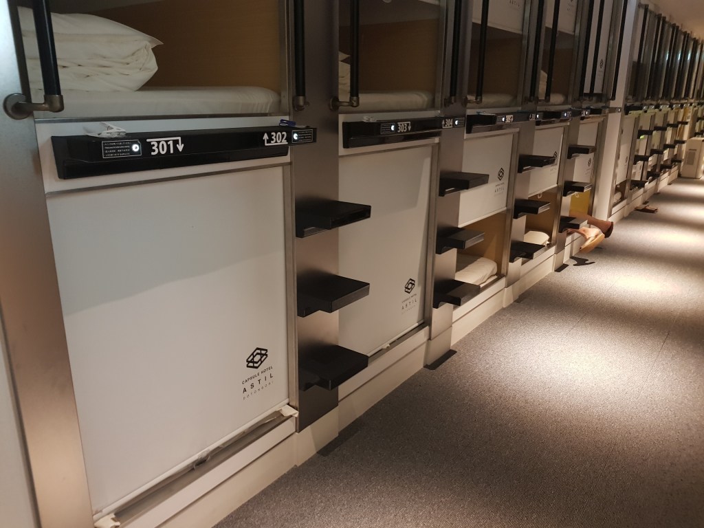 L’hotel càpsula va ser una passada, ens imaginàvem molta menys comoditat, probablement si n’haguessim provat un abans, n’hauríem reservat molts més. La part dolenta és que dormíem en plantes separades ja que estava dividit per sexes, però les càpsules no eren gens claustrofòbiques, tenies televisió i ràdio i els espais comuns eren molt més que correctes. Al entrar deicxaves el calçat en un armari i agafaves unes xancletes amb les que et movies per l’hotel, anaves a la teva planta i en un armari feies el mateix amb la motxilla, agafant d’allà tovalloles, bata i tot el necessari. I creuant l’habitació de les càpsules, uns lavabos molt ben equipats amb tot tipus de cremes i sabons, molts més dels que jo faria servir a Barcelona. No us adjunto el nom de l’hotel ja que ha tancat recentment a causa de la pandèmia. Llàstima…