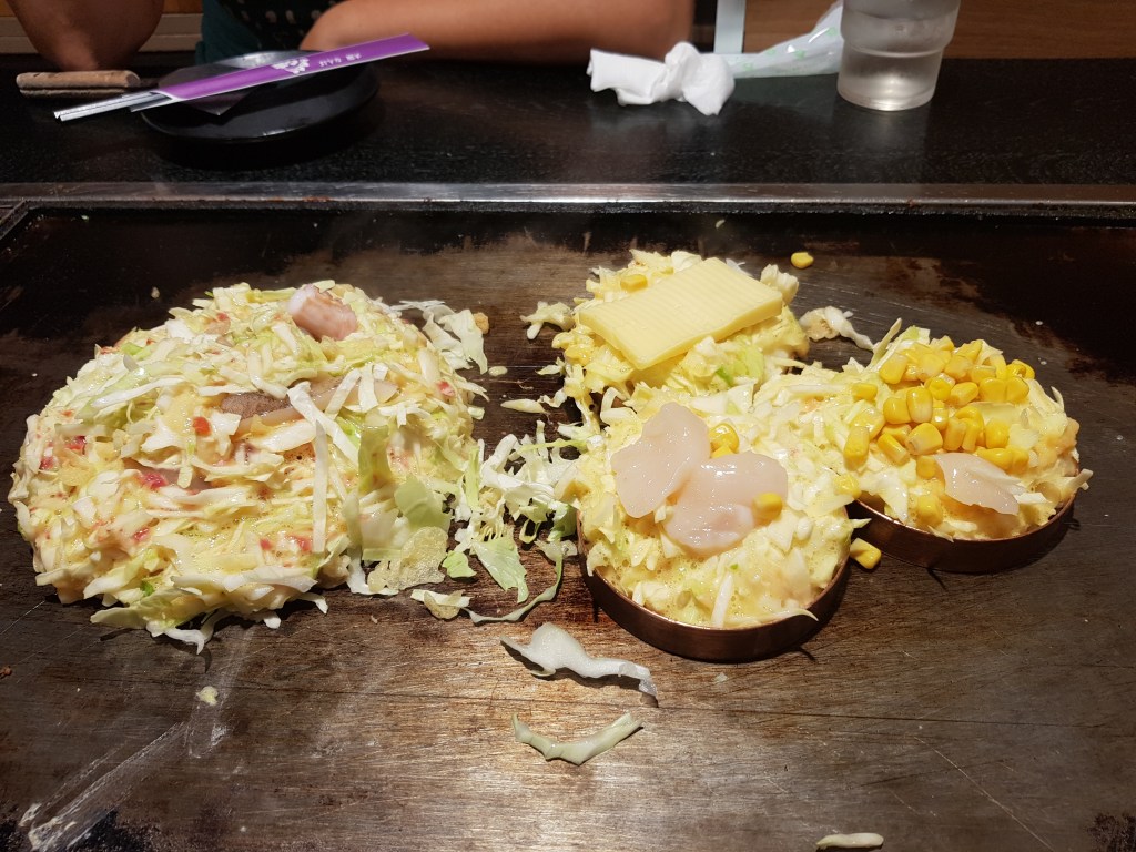 Vam menjar un okonomiyaki “normal” (destacable que utilitzen un ingredient que era nou per nosaltres fins aquell moment: la mostassa)i tres de raros per veure si els gustos funcionaven i us podem dir que estava tot bastant bo. I això tenint en compte que t’ho cuines tu mateix i nosaltres érem força deficients com a cuinadors d’okonomiyakis. Vam tastar el de formatge, el de blat de moro i el de vieira (que evidentment era el més bo de tots).