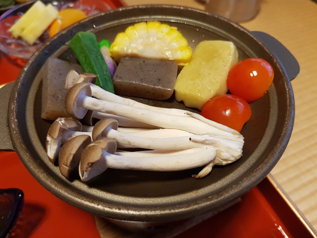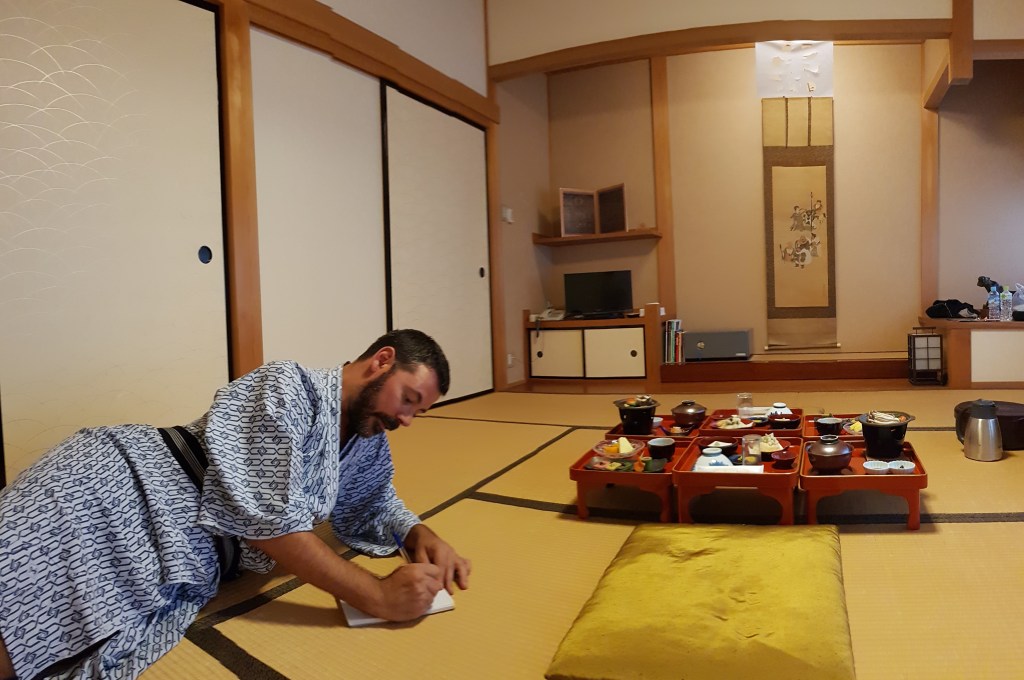 Vaig aprofitar que la Mar allargava la visita per posar al dia el diari, ja que això, encara que ho sembli, no s’escriu sol i sinó després es fa impossible recordar les anècdotes o les dades més interessants del lloc on ens trobem (diria que no actualitzava el diari des que érem a Miyajima, imagineu-vos la magnitud del drama). Abans de sopar vam baixar a provar els banys amb experiències molt diferents: mentre la Mar gaudia tranquil·lament, jo entrava a una sala atapeïda de senyors de totes mides i nacionalitats, a risc d’acabar fent un tres de nou amb folre i manilles dins la piscineta d’escassos 40 centímetres de fondària. Al final, per sort, la gent va anar marxant i vaig poder banyar-me amb relativa tranquilitat. Un cop a l’habitació, un noi molt amable va entrar i ens va començar a muntar la taula i els mil platets que soparíem. El sopar era tot curiós, amb alguns plats de textures gelatinoses que no ens van acabar de convèncer però en general el vam gaudir. Un cop sopats, van venir a muntar-nos els futons i ens van desitjar bona nit, però nosaltres encara no estavem preparats per donar per acabat el dia.