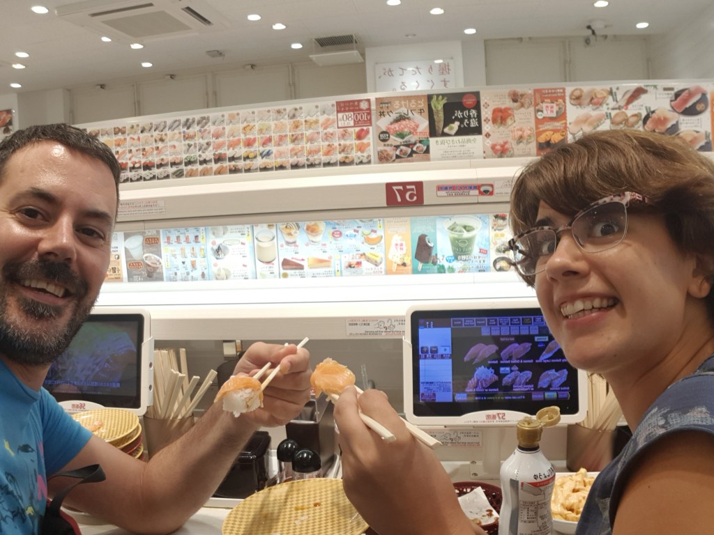 El Uobei sushi, un encert amb majúscules. És cert que no és el suchi de millor qualitat que vam menjar al viatge, però era bo (d’un nivell mig-alt a qualsevol restaurant japonès de Barcelona) i ens vam atipar per 13 euros tots dos. I jo menjo molt. I, a més, em vaig equivocar amb la pantalla tàctil i vaig demanar alguna cosa que vam acabar regalant. Vaja, que el preu, molt competitiu i l’experiència de veure arribar els platets per la cinta va estar molt bé. S’ha de fer una mica de cua però val molt la pena.