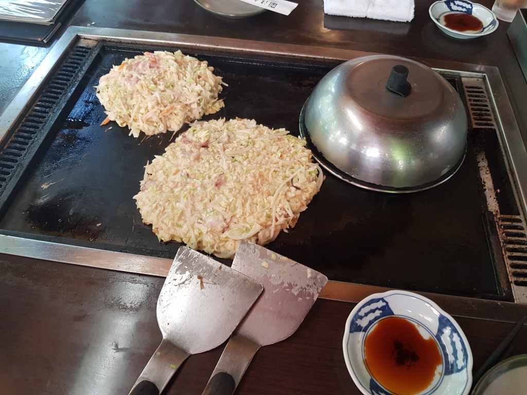 La Hiromi ens va dur a tastar el nostre primer okonomiyaki en un lloc molt tradicional on te’l feies tu mateix. L’okonomiyaki és una de les perles de la gastronomia japonesa i un dels temes de discussió per antonomasia. Alguns són partidaris de la versió d’Osaka i alguns de la d’Hiroshima. La diferència principal és com es fa la barreja dels ingredients i, sobretot, si duu noodles o no. Nosaltres en aquell moment no ho sabíem, però acabaríem per ser veritables experts (i amb un clar guanyador de la batalla Osaka-Hiroshima, ja ho veureu).