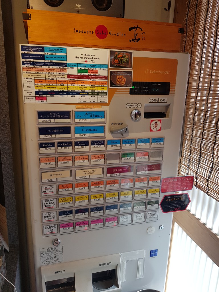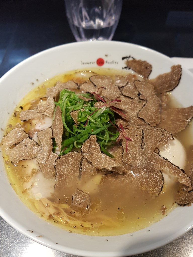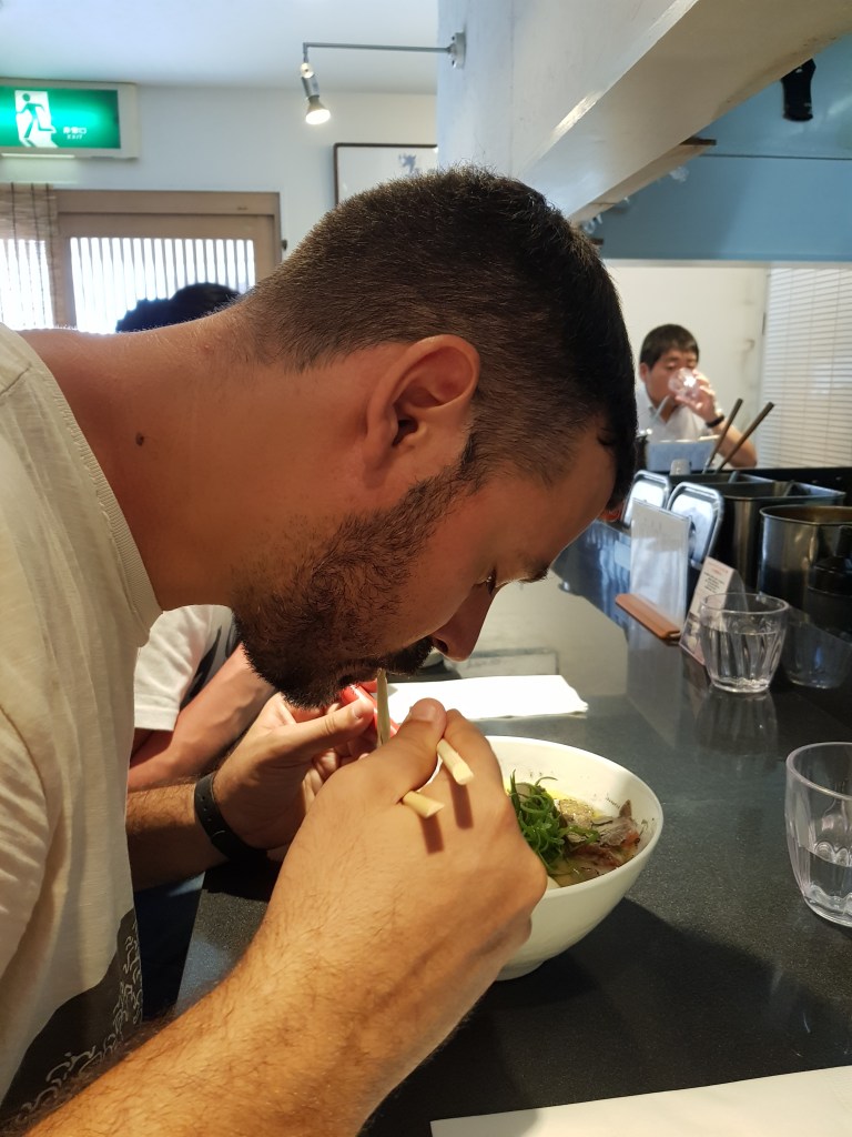 L’experiència al Tsuta va ser espectacular. Vam arribar poc abans de la 1, vam fer la cua pertinent per accedir al restaurant (que és minúscul), triar el ramen a la màquina (sort que hi havia versió en anglès per entendre quelcom) i un cop triat i pagat, tornaves a sortir fora a esperar. Vam triar una de les especialitats del local, que és un miso ramen amb trufa que és dels que més fama ténen. Després de 5 minuts esperant fora, vam ocupar un dels 9 seients a la barra i ens vam disposar a gaudir del show. Només veure els cuiners preparant els ingredients, barrejant les salses, cuinant els fideus… era un vertitable espectacle, com si estiguessim veient una performance artística. I quan semblava que ja estava tot fet i col·locat amb una precisió de cirurgians, seguien barrejant, decorant i, com a punt culminant, et ratllaven mitja trufa (literal) sobre el ramen. Sense cap mena de dubte, una de les experiències gastronòmiques del viatge i per un preu molt econòmic pel que sol ser un restaurant d’estrella Michelin.