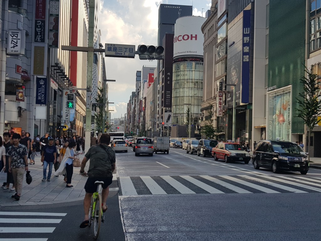 Més que satisfets amb l’àpat que acabavem de fer, vam canviar Yanaka Ginza per Ginza. Us seré sincer i us confessaré que no tenia massa ganes d’anar-hi, havia llegit molts cops que és el barri “pijo” de Tokyo i on es troben les tendes de moda i blablabla. Vaja, el típic lloc que nosaltres solem evitar a totes les ciutats que visitem. Però s’ha de reconèixer que Ginza és molt més que boutiques i grans avingudes. Es pot fer una ruta super interessant d’edificis originals i hi ha tota la zona dels bars temàtics que té també molta gràcia. Però no ens avancem.