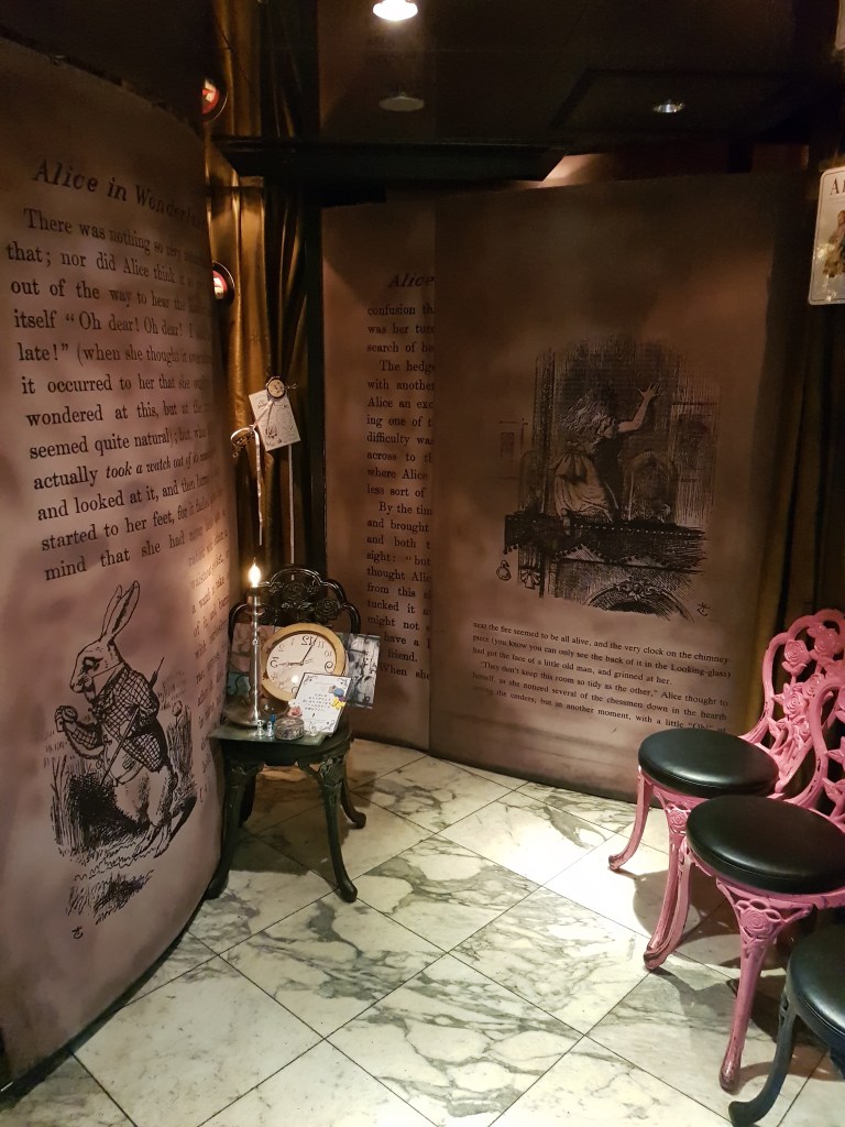 Ja semi enamorats d’un barri del que esperavem més aviat poc (rucs, mai s’ha de prejutjar!), vam entrar a mirar botiguetes (sobretot algunes pastisseries on la Mar s’ho hagués menjat TOT), vam veure per fora el Teatre Kabukiza i vam caure en la temptació de visitar un dels mil bars-restaurants temàtics que es poden trobar a la ciutat. Vam buscar per internet i n’hi havia de vampirs, de robots, d’animals… el que tenia millors reviews sense haver de marxar del barri era un que estava dedicat a l’Alícia al país de les meravelles, així que vam esperar que obrissin i vam pujar. És super curiós que hi hagi tants establiments que no veus a peu de carrer. Molts restaurants, botigues i fins i tot hotels on arribes amb un ascensor.