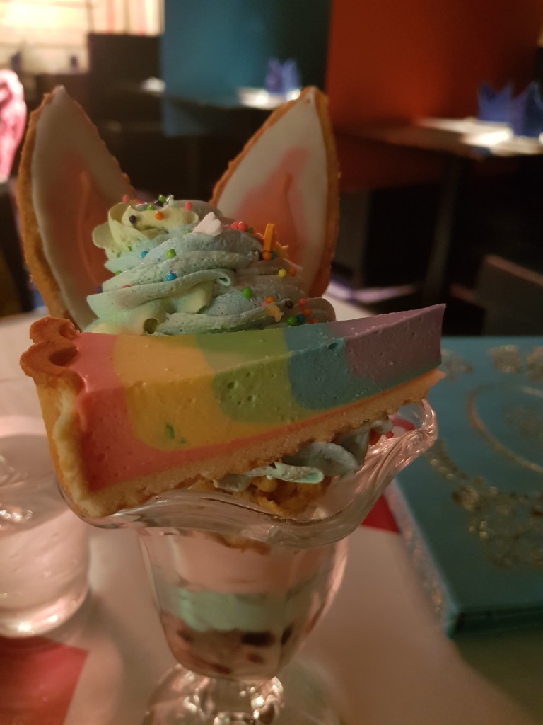 El lloc era molt pintoresc: et rebien unes cambreres disfressades i, creuant un passadís fet de pàgines gegants del llibre, arribaves a la sala on hi havia una tassa gegant i uns menús tots curiosos. Els detalls estaven realment cuidats. Vam berenar unes marranades super dolces i colorides mentre tararejavem les cançons de Disney que teníen de fil musical…evidentment en japonès.