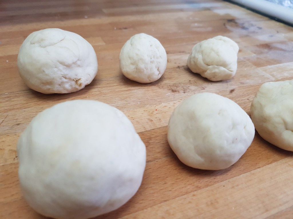 2- Fes boles de dues mides: les petites com una pilota de ping pong i les grans una mica més inflades. Assegura’t que te’n surtin el doble de petites que de grans. Tapa les boles grans amb un drap humit perquè no s’endureixin.