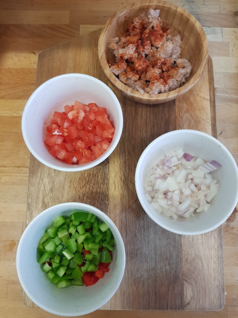 4- Talla la ceba, el tomàquet i els pebrots ben petit perquè es puguin cuinar bé dins el farcellet sense necessitat de fregir-los abans i barreja-ho en un bol.