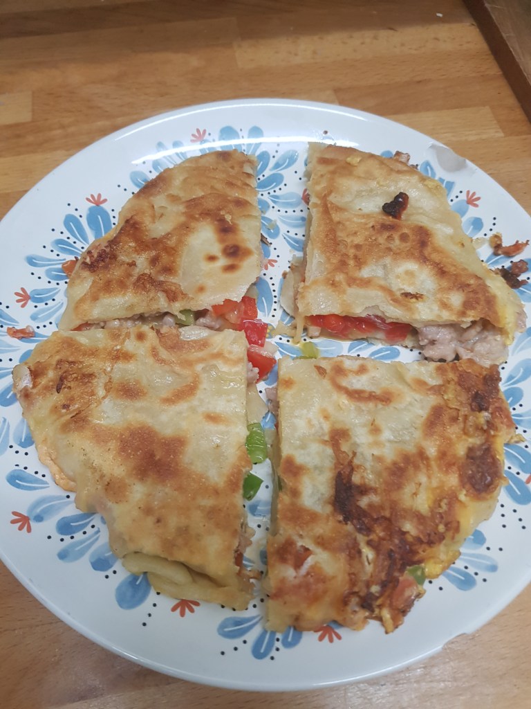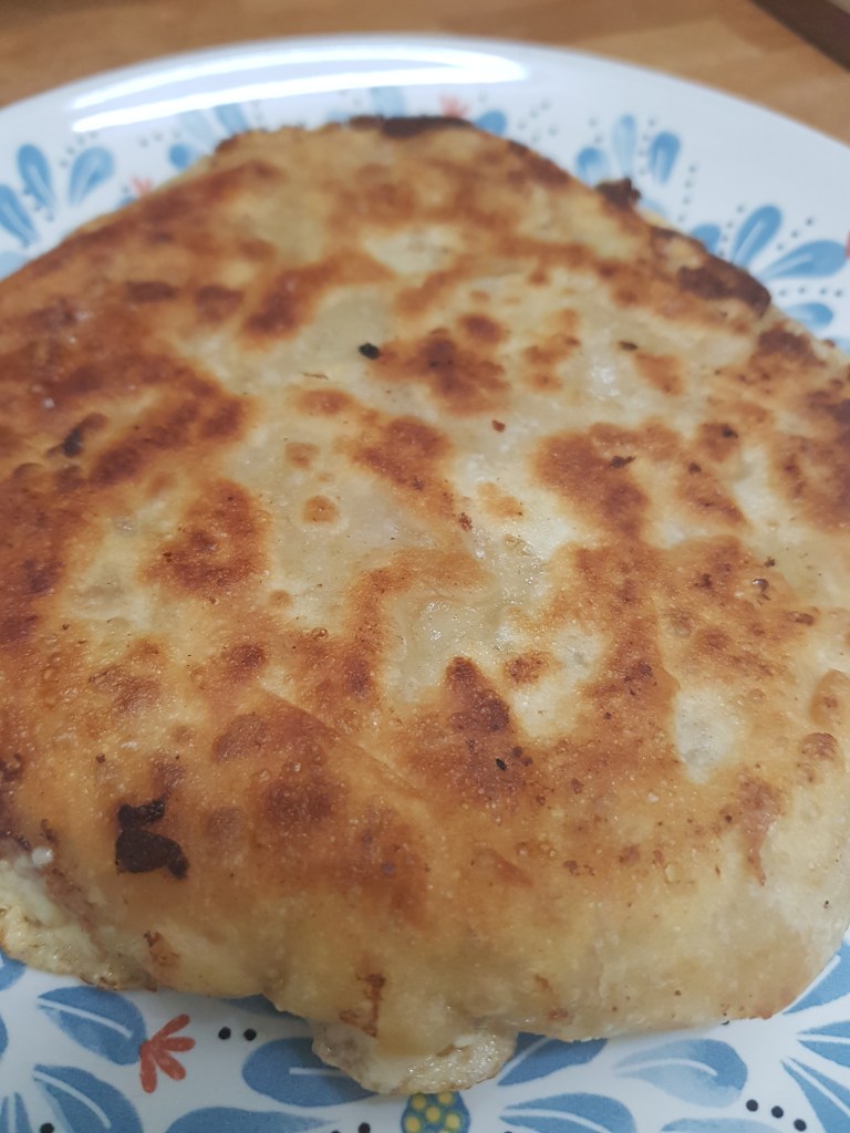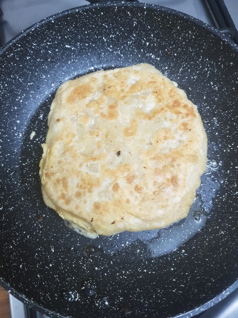 9- Amb una espàtula, agafa la pizza de Zanzibar per sota amb compte i posa-la a la paella amb l’oli/mantega ben calent. Ves aixecant amb l’espàtula i, quan la base estigui daurada, dóna-li la volta amb compte de no escampar-ho tot. De nou espera a que estigui daurat (ves apretant una mica mentre es cuina perquè la calor arribi bé a l’interior) i retira-la.