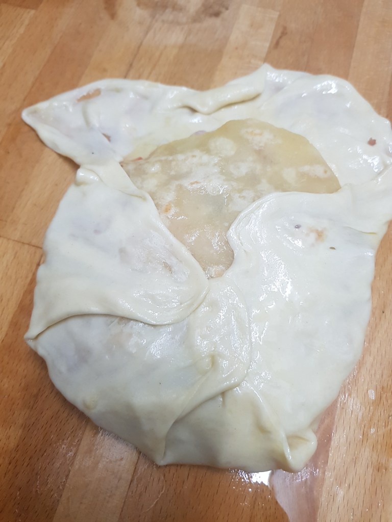8- Col·loca una base cuinada a sobre i tanca el farcellet intentant que la massa s’enganxi entre ella perquè no s’escapi res. No ha de fer la volta sencera, us quedarà la base cuinada i un tros de farcellet per cada cantó.