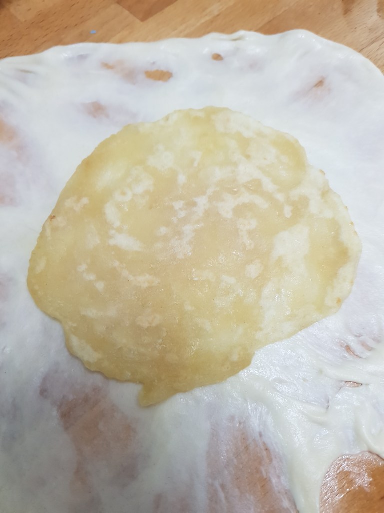 8- Col·loca una base cuinada a sobre i tanca el farcellet intentant que la massa s’enganxi entre ella perquè no s’escapi res. No ha de fer la volta sencera, us quedarà la base cuinada i un tros de farcellet per cada cantó.