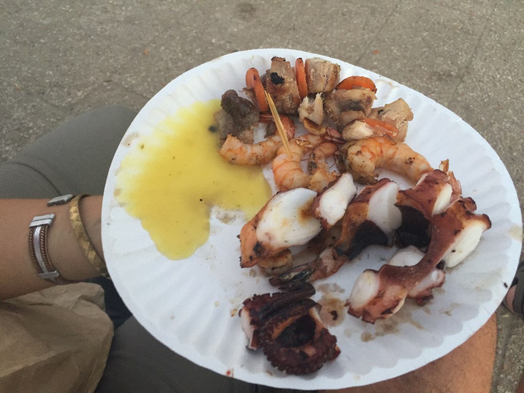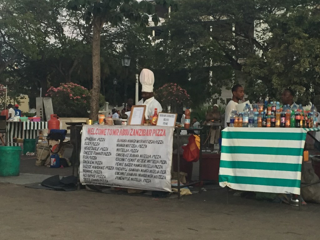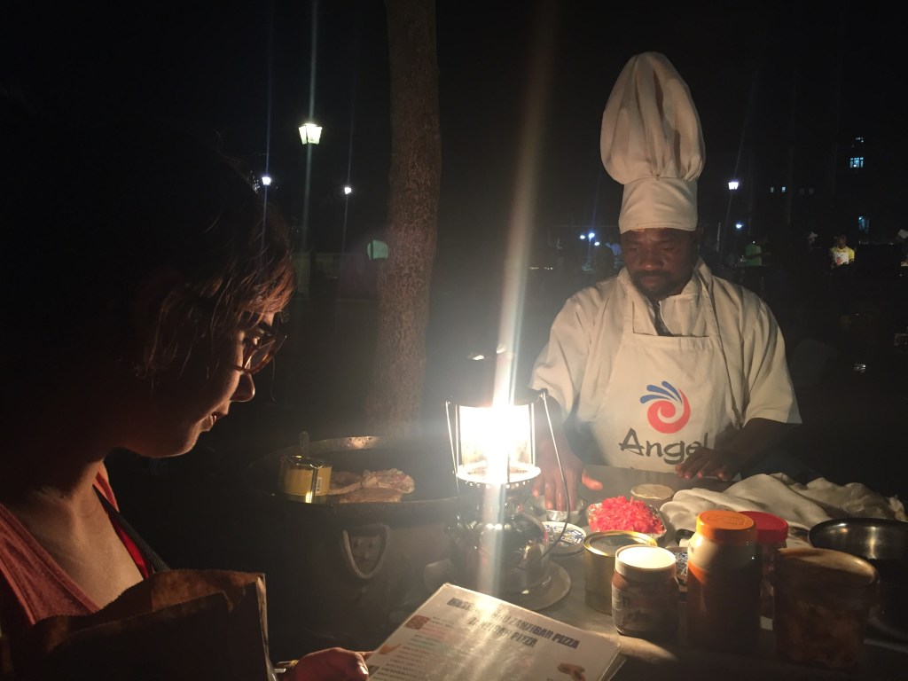 Vam sopar al mercat de Forodhani aviat ja que no havíem dinat i la veritat és que vam gaudir moltíssim de la gastronomia local: pintxos de gamba, pop, barracuda i pastanaga, pizza de zanzíbar de carn, xampinyons i salsitxa (no sembla per res del món una pizza.. es una espècie de crep hiper deliciosa que vam aprendre a fer i de vegades ens la fem a Barcelona!), panotxa de blat de moro, pintxos de llagosta, gamba i “peus de mar” i de postre, una pizza de zanzíbar de nutella, platan i snickers! A part del menjar que era molt bo, l’ambient era molt agradable i simpàtic!