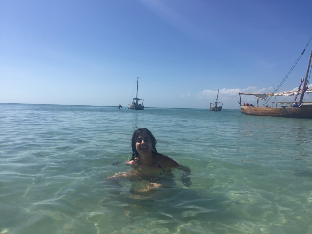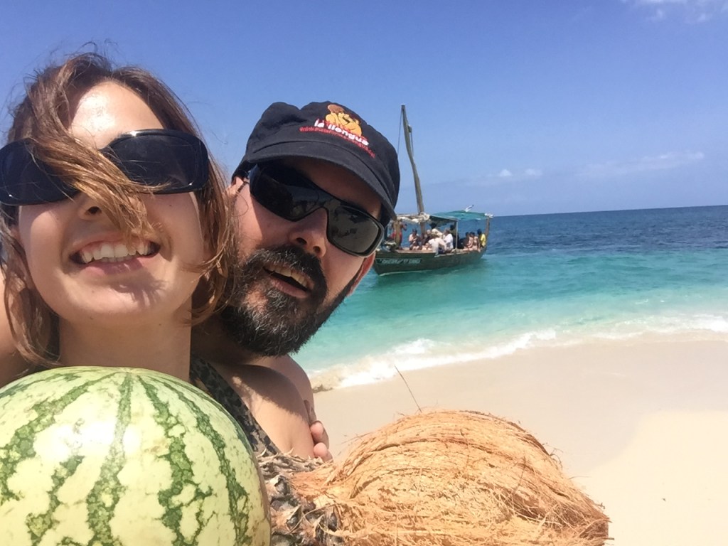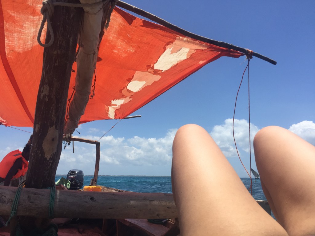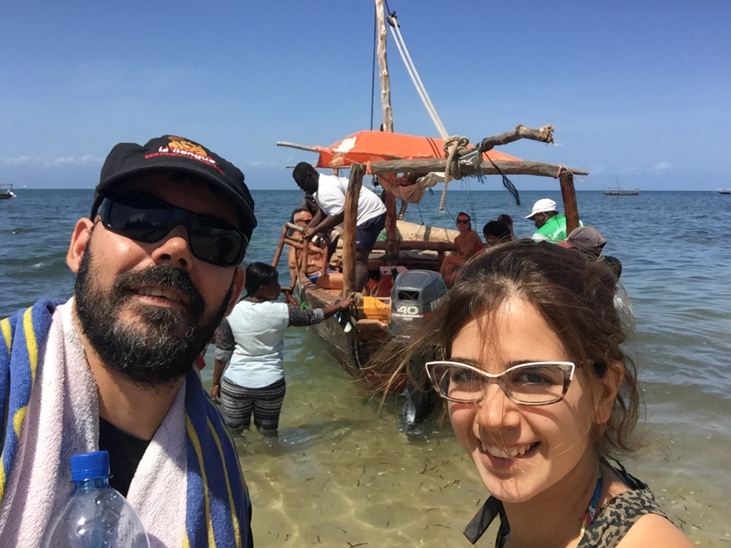 Vam pujar a una barqueta de fusta que compartiríem amb uns sudafricans, unes tanzanes, un italià… i vam iniciar el trajecte cap al banc de sorra que seria la primera parada. La barqueta molt pintoresca i el paisatge preciós. Allà el Karembeu va muntar un toldet i vam estar-nos banyant i menjant fruita.