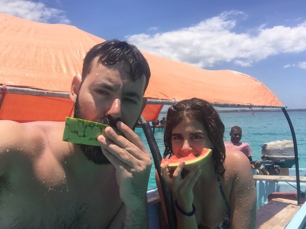 Després de 40 minuts a la furgo amb els 4 madrilenys i el Karembeu vam arribar a Matemwe on agafaríem un barquet fins a la illa de Mnemba. La illa està evnvoltada de corall així que vam estar fent snorkel, menjant fruita i remullant-nos.