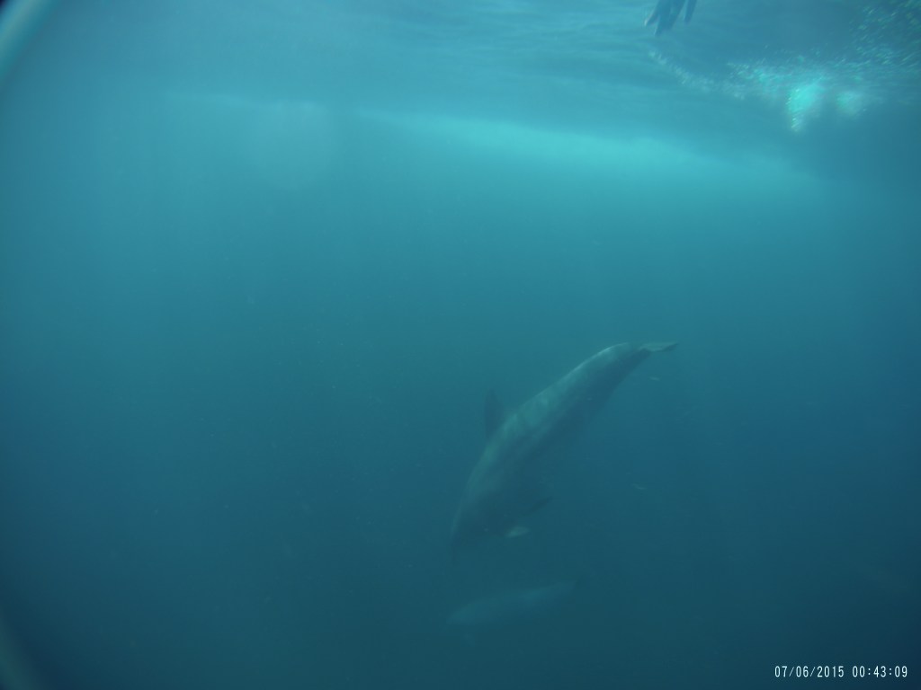 Anàvem a banyar-nos amb dofins! La gràcia és que són dofins en llibertat i tu vas on solen estar ells (hi són per la quantitat de menjar que troben a la zona, de manera que també està ple de peixos, meduses i de vegades algun tauró). Vam començar a allunyar-nos de la costa, cada vegada més fins que vam arribar a la zona on ja se’n veien. Creiem que aquesta experiència hagués estat una mica més agradable sense el munt de vaixells amb els que vam coincidir que pretenien fer el mateix (bé, el mateix no… ells els miraven des de la barqueta, mentre que nosaltres ens tiràvem a l’aigua per nedar). Però vaja, que a nosaltres ens sobraven ells i a ells els sobràvem nosaltres! Feia impressió banyar-te allà ja que estàvem tant lluny de la costa que el fons era molt profund… no es veia el terra i això feia moltíssima impressió.