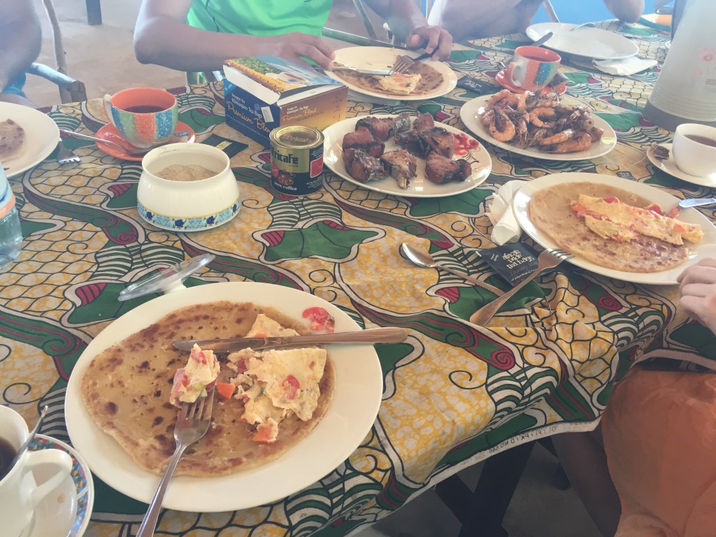 Com que ja ens havíem remullat bastant, havíem vist dofins, estavem mig recremats i una de les Madrilenyes amb el moviment de la barca es marejava i s’estava trobant fatal semi-vomitant, vam decidir tornar i anar a esmorzar per recuperar forces: un esmorzar brutal! Fruita, chapati amb verdures, peix, gambes, te…