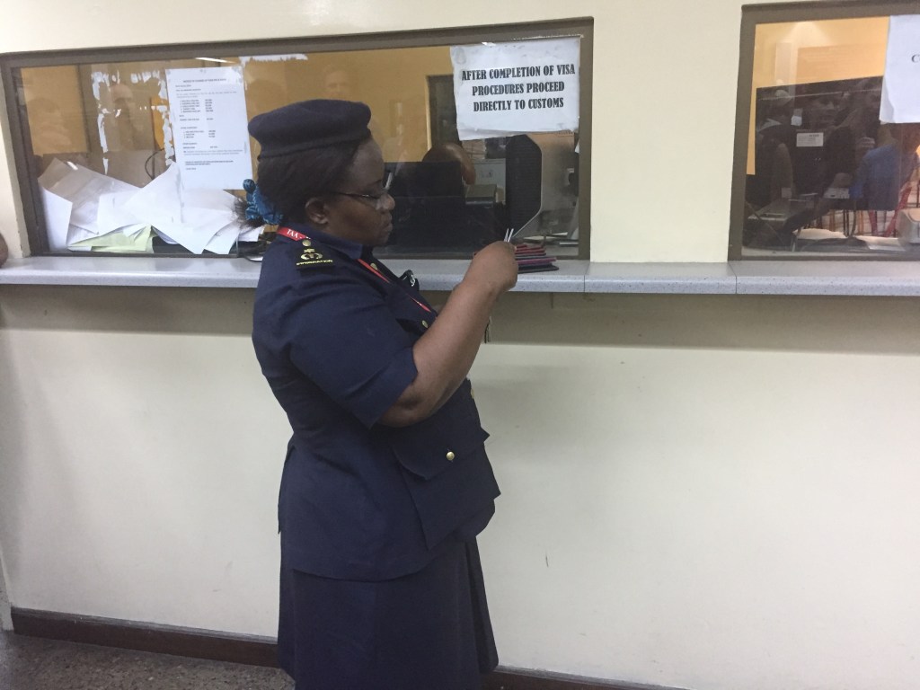 Allà, una dona sortia cada 5 minuts amb un feix de passaports i anava cridant pel nom (o la seva versió en swahili) als amos del corresponent passaport, comprovant mínimament que t’assemblessis al de la foto del passaport que et donava. Tot això a crits i a 35º, sense cap mena de comprensió idiomàtica entre uns i altres.