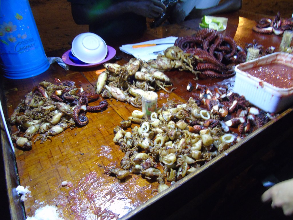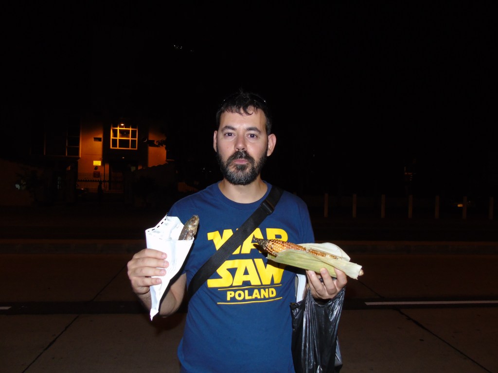 A mesura que s’anava fent fosc vam anar tornant cap a l’hotel i ens vam trobar unes paradetes al carrer: n’hi havia de fruita, de sabates, pulseres, collarets, peix cru, peix fregit, pop i calamar picants (i deliciosíssims), panotxes de blat de moro fetes a la barbacoa amb llima, sal i xile…
