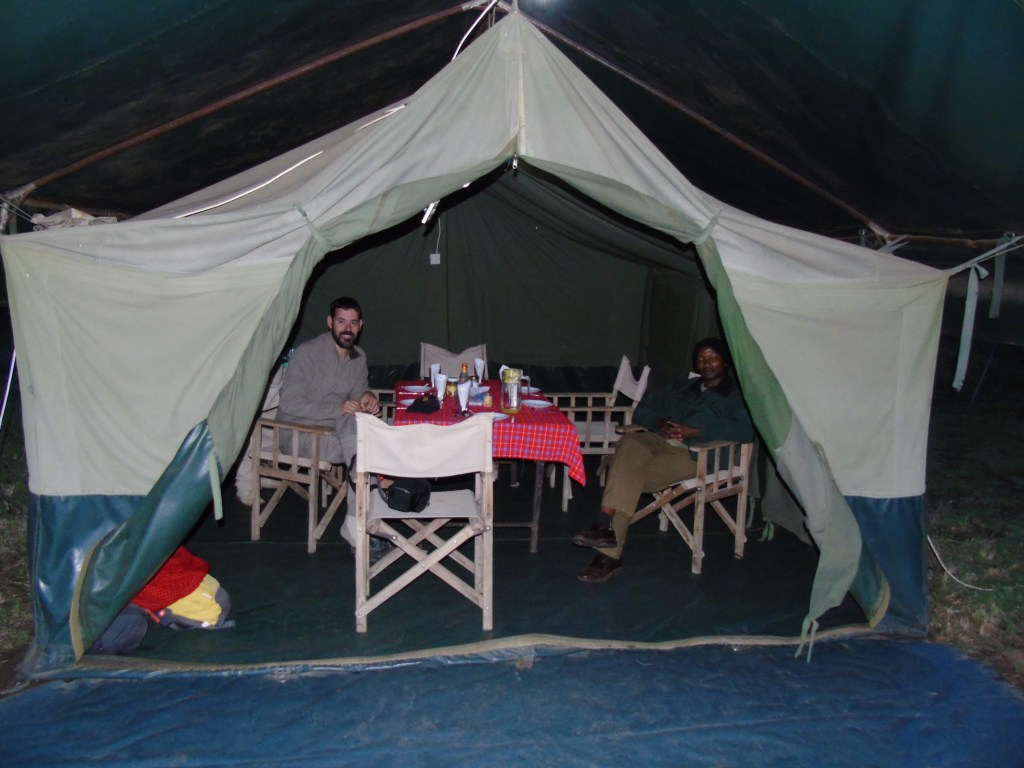 Vam sopar a la tenda – menjador (recomanaven no tenir menjar dins l’habitació ni fer àpats dins per evitar que els animals vinguessin atrets per la olor) i vam tenir una nit molt emocionant en què vam sentir búfals passant tant a prop que van fregar la nostra tenda de tela (vam descobrir l’endemà al matí que havien estat búfals parlant amb el Godfrey i fent una comprovació de les caques que hi havia al voltant de la tenda).