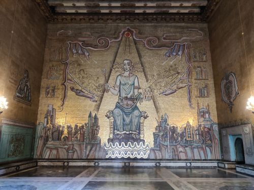 Probablement l’edifici més representatiu de la ciutat i un dels més bonics. Més enllà de l’estil venecià, la cúpula de les tres corones o el seu raconet davant del mar, destaca per les seves dues sales principals. A la Sala Blava s’hi troba l’orgue més gran d’Escandinàvia i és on es fa el sopar dels premis Nobel (i es diu sala blava perquè HAVIA de ser blava, però és de maó vermell) i la Sala Daurada és una de les coses més precioses que veureu a Estocolm. Feta amb 18 milions de peces d’or, narra la història de la ciutat i dóna per passar-hi hores admirant cada detall, des de la reina del llac fins als emisaris del món que la van a saludar o el rei Erik decapitat. Llàstima que només es pot veure amb visites guiades i tens escassos deu minuts per veure-la. És molt bonic fer la visita, però a part de fer el recorregut, el podeu fotografiar des d’altres illes i sempre és impressionant.