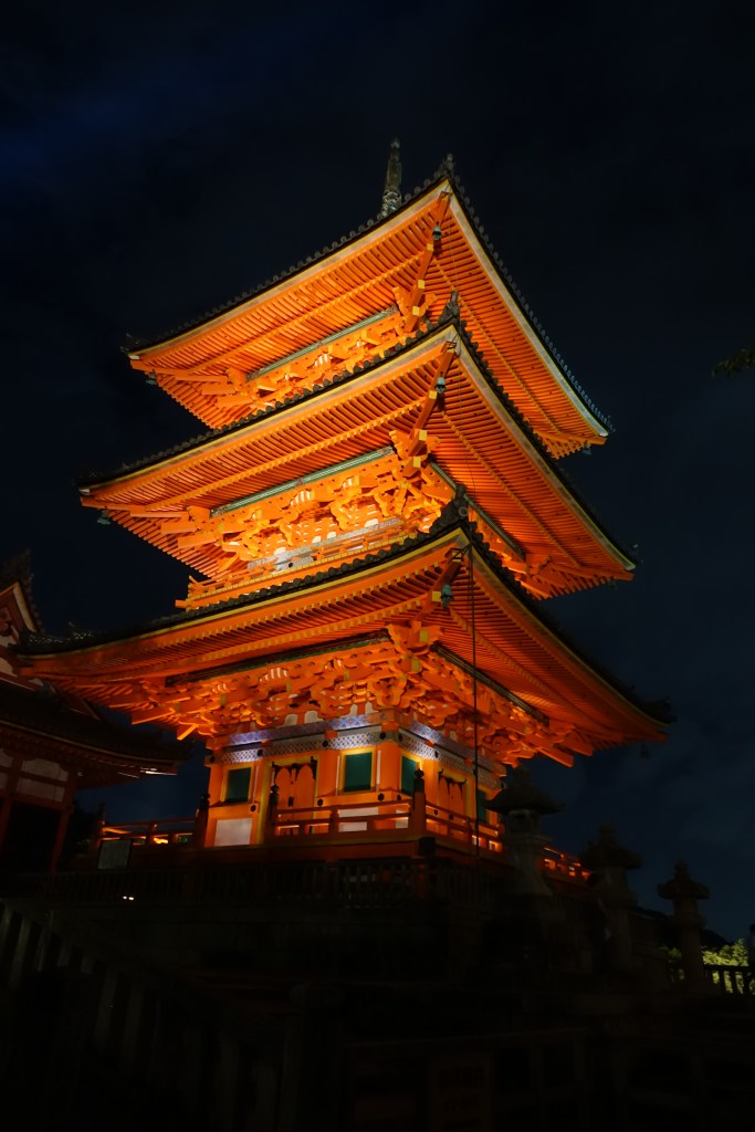 Vam tenir la sort de visitar Kyoto durant l’Obon, així que vam poder visitar el Kyomizu Dera de nit i que ens obrissin les portes del saló principal (de normal tancat al públic excepte 3 nits en tot l’any) pel Sennichi Mairi, o “mil visites”. Se suposa que si aquell dia visites el temple, és com si ho fessis mil cops, amb el valor afegit de les pregàries que realitzes en una nit tan especial. Independentment d’aquest detall, com a temple és molt bonic i les vistes que n’obtens valen moltíssim la pena.