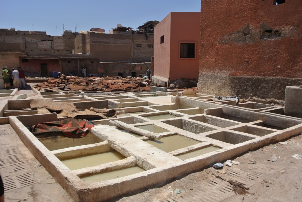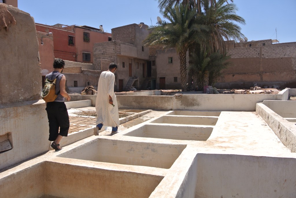 El primer que faran és donar-vos un ramet de menta per fer de “màscara de gas” i accedireu a la zona de les piscines, on us explicaran el procés, molt curiós i original. Primer amb cal viva s’eliminen els pèls i altres irregularitats de la pell, a continuació queda submergit en excrement de colom (aquí l’olor és terrible, sort de la menta) i un cop neta, se li apliquen els tints naturals segons el color que es vol obtenir. Després, com no podia ser d’altra manera, us duran a veure productes perquè compreu alguna cosa. Aprofiteu per practicar el regateig, a Marroc us farà molt servei!