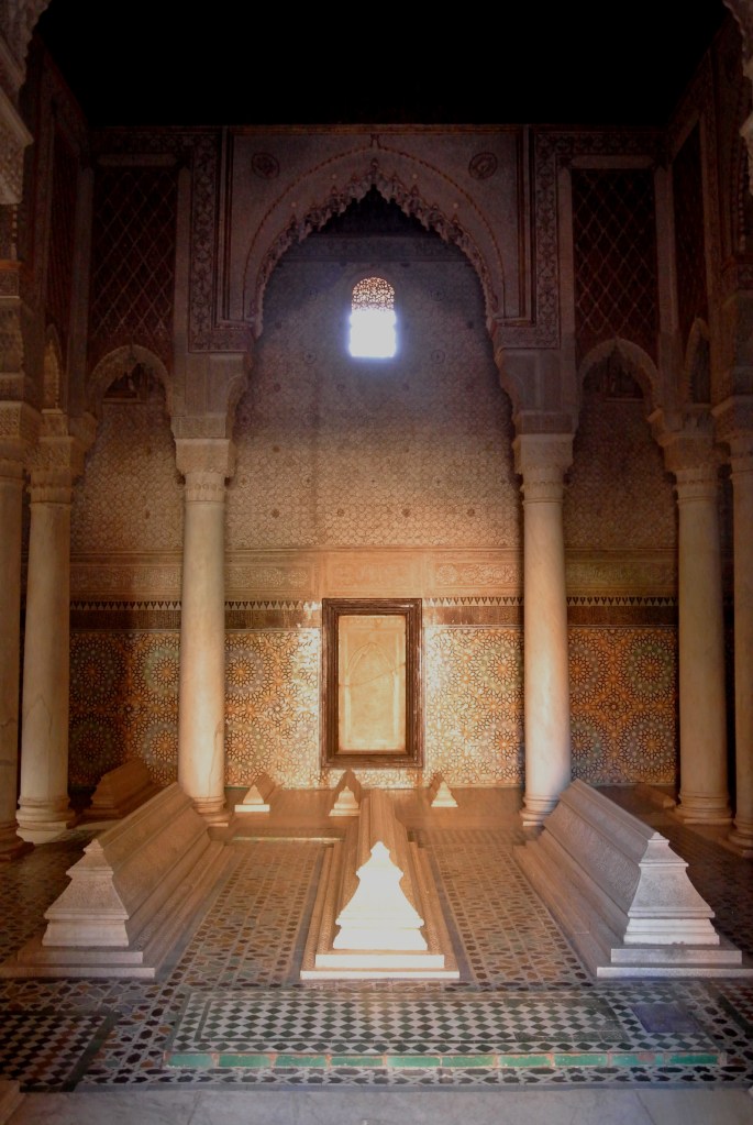 Les tombes sadites daten del segle XVI però no van ser descobertes fins al 1917, moment en què es van obrir al públic, convertint-se en una de les atraccions principals de Marrakech. Al Mausoleu Principal hi trobem a Ahmad al-Mansur i la seva família, mentre que al jardí, entre les 100 tombes, hi ha els cossos de soldats i criats de la família. L’entorn és molt agradable i les sales molt ben ornamentades. Jo sóc molt fan d’aquest tipus d’arquitectura i puc no semblar objectiu, però és que a banda dels arcs i l’ornamentació,hi ha tombes que estan fetes amb marbre de Carrara!