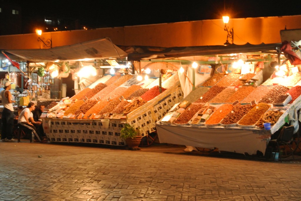 El centre de la Medina i probablement la zona més important de tota la ciutat, tant de dia com de nit. Durant el dia, per culpa de la calor i la falta de cap lloc on resguardar-se, esdevé la sortida natural del mercat i hi tenen una presència important les parades de suc de taronja, deliciós, amb el punt just d’acidesa. A la nit, però, és quan per mi està més bonica. Quan es pon el sol, comencen a muntar les paradetes de menjar (molt recomanable prendre un te amb menta a una de les terrasses que envolten la plaça i veure com queda totalment ocupada en qüestió de 15-20 minuts) i l’espectacle de fum i olors és espectacular. Nosaltres hi vam sopar vàries nits, ja que per preu, qualitat i autenticitat, trobareu poques opcions millors.