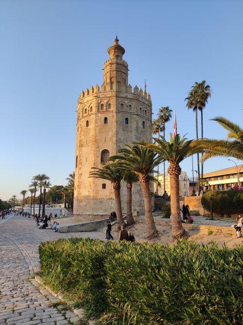 La Torre del Oro es va construir amb una finalitat defensiva per la seva privilegiada posició al riu, des d’on amb l’ajur una cadena de dimensions enormes podia frenar la incursió de possibles atacants per via fluvial. Avui en dia la veiem sola a la vora del riu però havia format part d’un entramat de muralles per garantir la seguretat de la ciutat. Durant el terratrèmol de 1755 a Lisboa va quedar força malmesa i es va plantejar la seva demolició però la ciutadania de Sevilla s’hi va negar en rodó. Les llegendes parlen de dues teories sobre l’orígen del seu nom: per una banda es parla de grans riqueses al seu interior i per això el tema de l’or; però la que més números té de ser certa és la que ens parla del reflexe del sol i el color dels seus maons creant aquest efecte visual. Sigui com sigui ara hi trobem un petit museu naval i a la part superior un mirador.