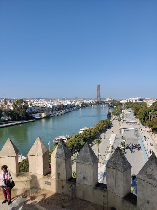 Un element comú a Sevilla és la barreja d’estils i com aquesta barreja ha fet que els edificis, places i barris siguin tan extremadament bonics. En el cas de la Giralda, era el minaret de l’antiga mesquita, que ocupava l’espai on ara hi ha la catedral gòtica cristiana més gran del món, on podem trobar la tomba de Colón i diversos retaules realment impressionants. Com a curiositat, la Giralda va estar a punt de ser derruïda per evitar que caigués en mans dels cristians però Alfons X va amenaçar amb tallar tants caps com maons faltessin a la torre. Per donar-li un aspecte lleugerament diferent la va fer coronar en estil renaixentista i li va posar el Giraldillo per recordar que ell havia vençut els infidels. És molt curiós que no hi hagi escales sinó 35 rampes per pujar a dalt la Giralda; això es deu a que per la seva condició de minaret una persona havia de pujar cada cop que s’havia de convocar a la pregària i era molt més pràctic que pogués pujar en cavall.