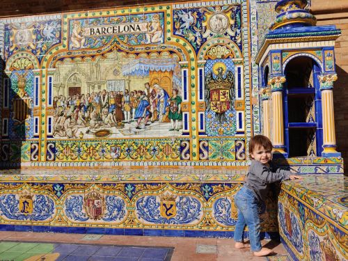 El Parque Maria Luisa era originalment part del Palau de San Telmo però el 1893 la Infanta Maria Luisa Fernanda de Borbón els va cedir a la ciutat. Per aquest motiu l’ay 1941 es van inaugurar com a Parque Urbano Infanta Maria Luisa Fernanda. L’any 1929, amb motiu de la Exposició Iberoamericana, es va construir la Plaza España, com una metàfora de l’abraçada de la ciutat de Sevilla (per això la forma de semicercle) a la resta dels territoris del país. Cada província (excepte Sevilla que està en 4 plafons sense banc i les províncies Canàries ja que en aquell moment era una sola prvíncia) té el seu racó amb un mapa, un fet destacable de la història i personatges importants de la regió, tot fet d’azulejos. Val la pena passejar-se per tots dos llocs tot i les ombres del Parque Maria Luisa són un lloc clau on passar estones, sobretot si viatgeu amb criatures.
