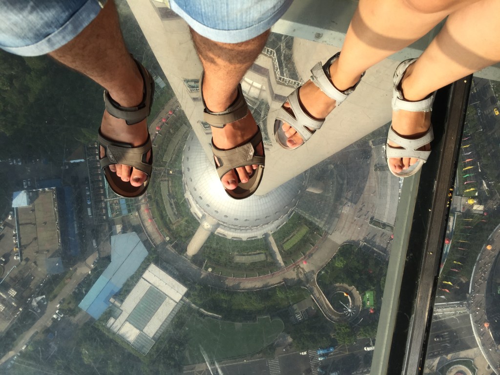 Pujar a la Torre de la Perla d’Orient és fer cues enormes i fotre algun cop de colze, però les vistes des dels miradors són d’un altre planeta. I ho dic literal perquè la decoració del mirador superior és de nau espacial i t’has de posar unes fundes ridícules als peus. També hi ha un pis on el terra es transparent i la sensació és brutal, sobretot quan hi ha tanta gent que la tanquen i et diuen que no pots sortir fins que es buidi de gent.