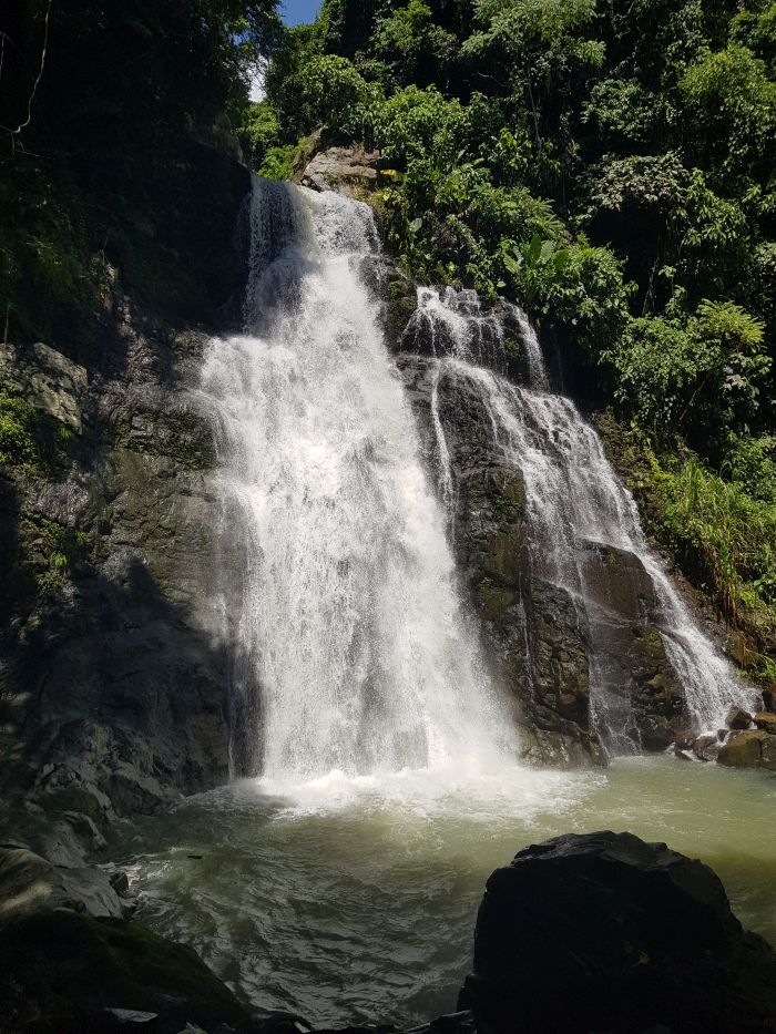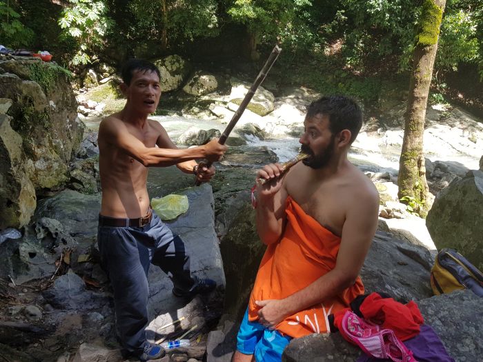 Vam agafar les motos en la mateixa distribució que el dia anterior: la Mar amb el Tri i jo amb el cunyat. Vam començar a tirar cap a l’oest i quan gairebé ja creuàvem la frontera amb Laos (jo anava mirant amb el GPS patint per si cometíem alguna il·legalitat) vam arribar a Thac Grang, un salt d’aigua impressionant on, evidentment, vam aprofitar per remullar-nos, per saltar a l’aigua des de pedrotes i per fer un tastet de coses d’allò més diverses. El Tri ens va assortir de cervesa i canya de sucre i uns nois que vam conèixer allà ens van donar fruites variades. Ens vam inflar a litxis, conformant una dieta de segon esmorzar super eclèctica.