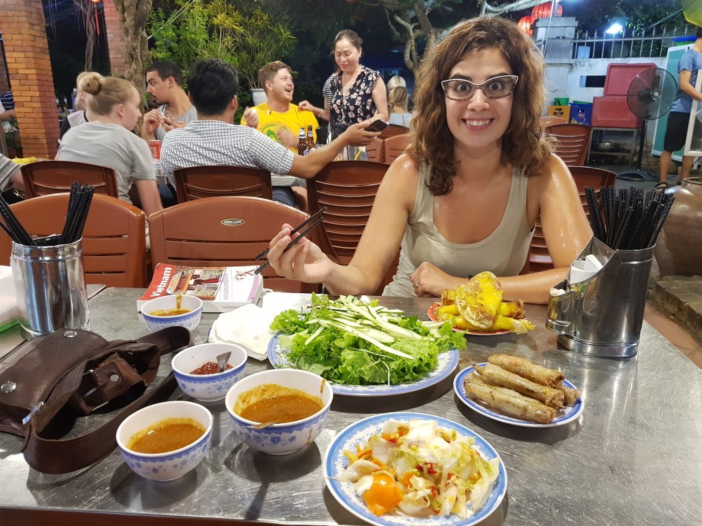 La dona ens va fer un tutorial però com podeu veure al vídeo adjunt, el meu primer farcellet va ser una mica deficient. Ara bé, la combinació era deliciosa! Com ens agrada el menjar vietnamita i quina gràcia fa entrar a un lloc així i potinejar sense saber massa el que estàs fent. Sort que el dia següent ens ensenyarien a cuinar!