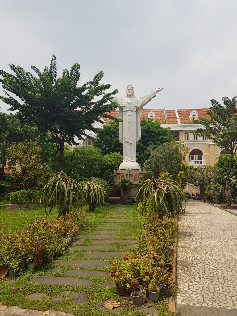 Ara si, vam arribar a la famosa i curiosíssima Església de Tan Dinh. Una de les peculiaritats és que és una de les poques esglésies catòliques de la ciutat i la que més crida l’atenció és que és de color rosa. Si, una església rosa, tot molt curiós. Ens va fer molta gràcia veure-hi adolescents fent-se fotografies amb l’església de fons com si fins i tot per ells es tractés d’una cosa molt original i diferent.